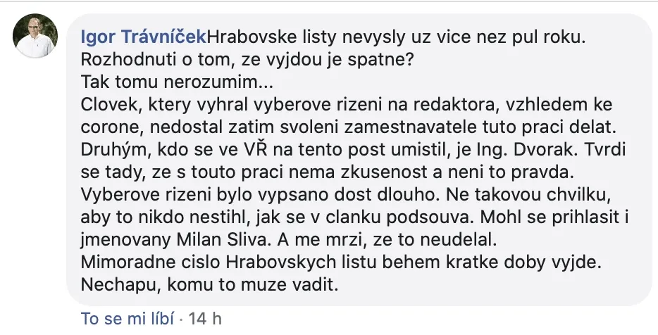 Igor Trávníček obhajuje svůj nápad s mimořádným vydáním Hrabovských listů ve spolupráci s Ing. Dvořákem. V nynější komplikované situaci, kdy nástup nového šéfredaktora je v nedohlednu, to vidí jako správné: