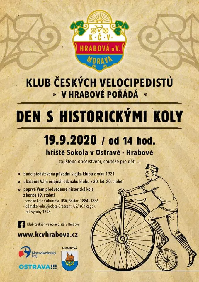 Klub českých velocipedistů v Hrabové pořádá 19.9. 2020 od 14 hod. „Den s historickými koly“. Akce se koná v areálu TJ Sokol Hrabová v Ostravě – Hrabové. Zajištěno občerstvení i soutěže pro děti…