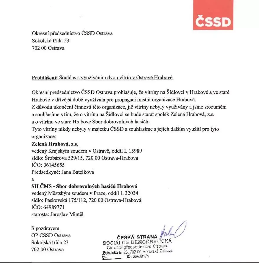 Proto jsme se rozhodli kontaktovat přímo okresní vedení ČSSD, kde nám bylo řečeno, že skříňka není v majetku politického hnutí ČSSD a že určitě budou jedině rádi, když bude skříňku někdo smysluplně využívat a starat se o ni (viz jejich písemné vyjádření). Poté následovalo potvrzení samotným úřadem, který i tuto skříňku vede a eviduje v majetku obce Hrabová.