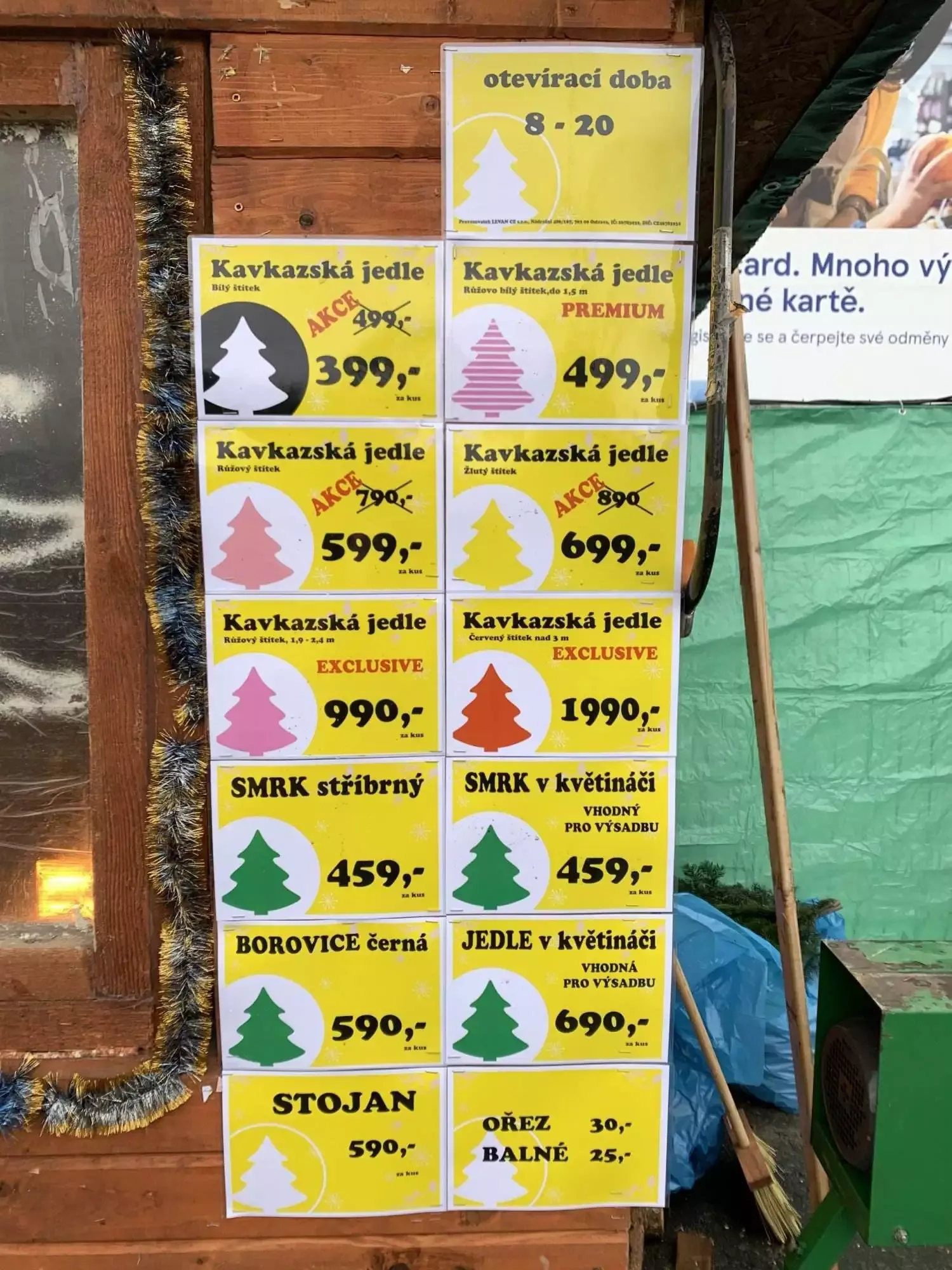 Každý den od 8-20 hod. (pravděpodobně včetně neděle, kdy mají obchody zavřeno, obsluha zatím nevěděla jistě) máte možnost za akční ceny zakoupit vánoční stromečky po pravé straně hlavního vstupu Tesco v Hrabové. V nabídce jsou smrk stříbrný 459 Kč, smrk v květináči 459 Kč, borovice černá 590 Kč, kavkazská jedle v akci za 399 Kč a další viz foto.