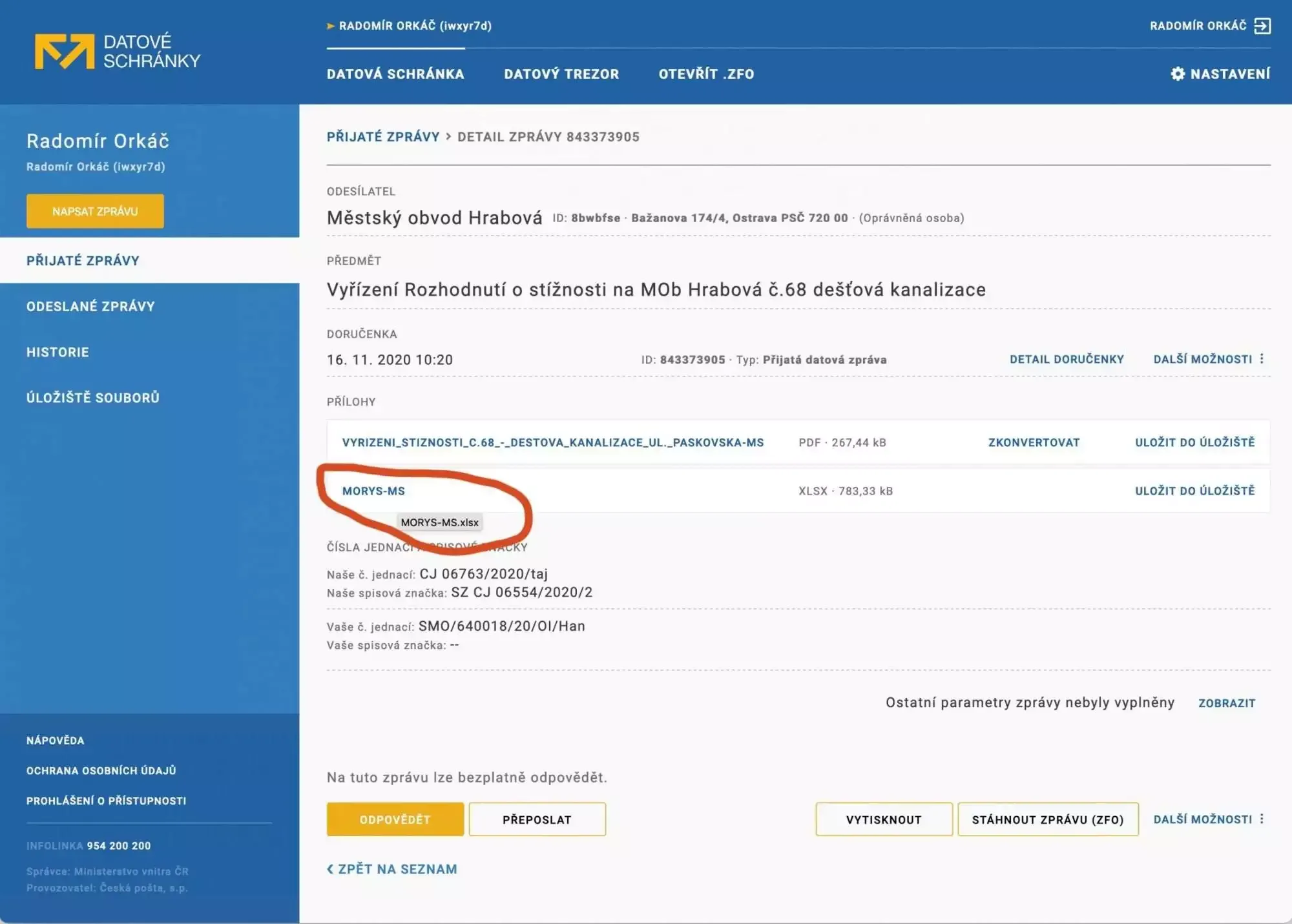 Zdroj: Můj požadavek ze dne 2.10. 2020 na úřad v Hrabové – „Zašlete mi ještě zvlášť PLNÝ položkový rozpočet, se kterým vyhrála společnost Morys ve formátu XLS(X).“. Ceny byly překopírovány z vysoutěženého položkového rozpočtu společnosti Morys, který mi dne 16.11. 2020 zaslal úřad v Hrabové prostřednictvím datové schránky (viz průkazný obrázek níže).