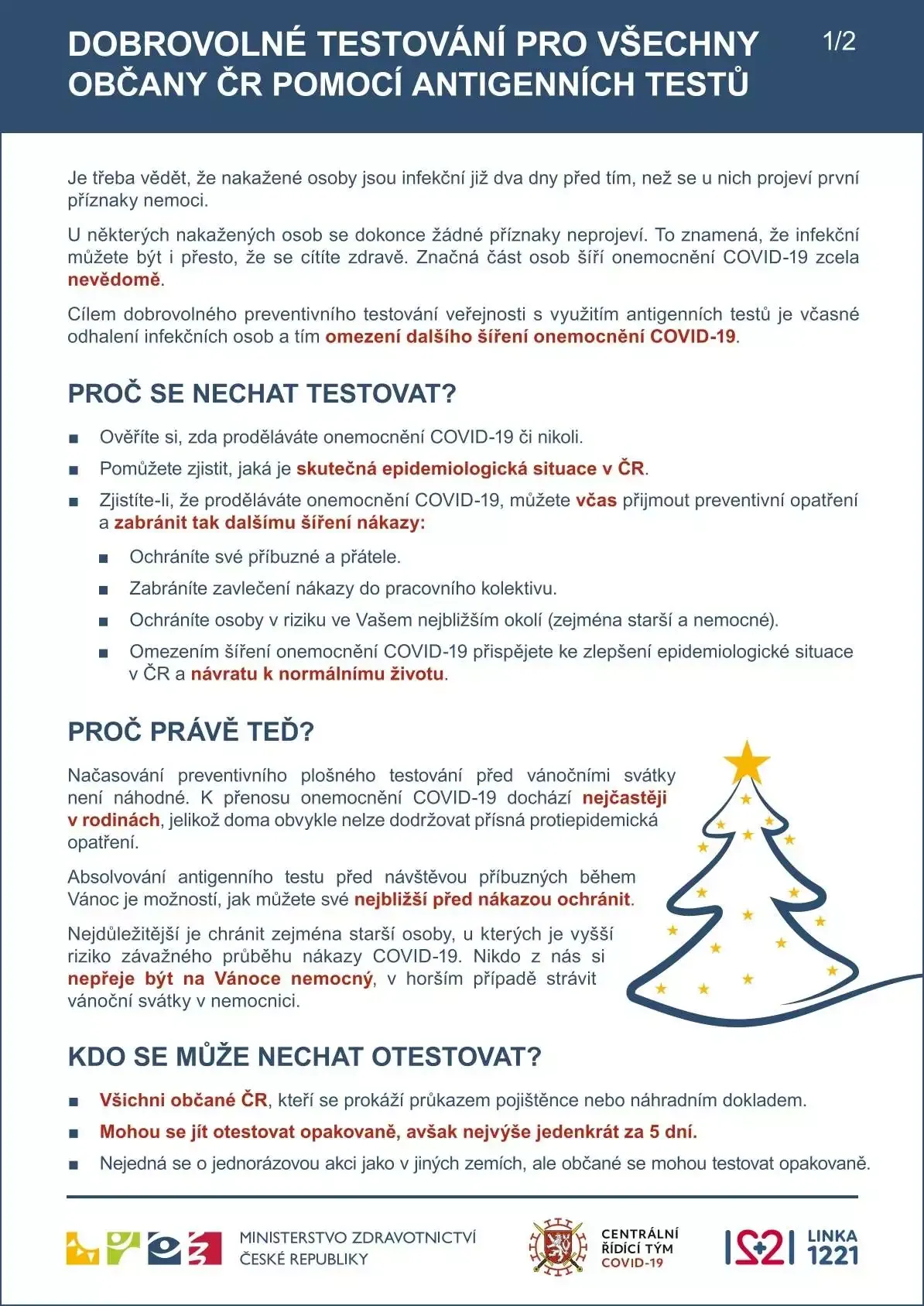 (Ministerstvo zdravotnictvĂ ÄŚR) Od 16. prosince 2020 do 15. ledna 2021 probĂhá dobrovolnĂ© antigennĂ testovánĂ obyvatel. Otestovat se mohou nechat všechny osoby, kterĂ© jsou účastny veĹ™ejnĂ©ho zdravotnĂho pojištÄ›nĂ v ÄŚeskĂ© republice. Na odbÄ›rovĂ©m mĂstÄ› pĹ™edložà prĹŻkaz pojištÄ›nce nebo náhradnĂ doklad.