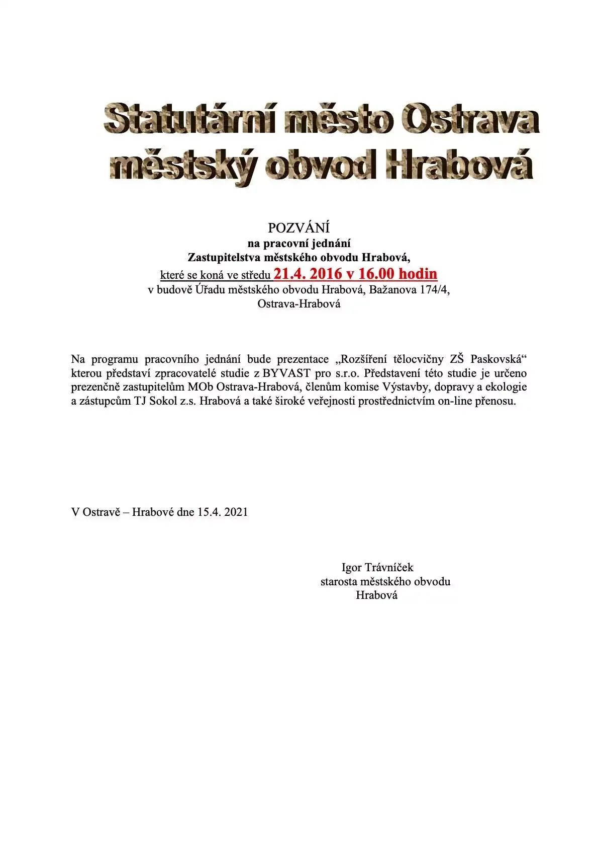 Dne 21.4. 2021 bude od 16. hod. prezentována studie „Rozšíření tělocvičny ZŠ Paskovská“. Představení této studie zpracovatelem (společnost BYVAST pro s.r.o.) je určeno prezenčně zastupitelům, členům komise a zástupcům TJ Sokol z.s. Hrabová, a také široké veřejnosti prostřednictvím online přenosu. Kdo bude online přenos zajišťovat zatím vedení městského obvodu blíže nespecifikovalo.