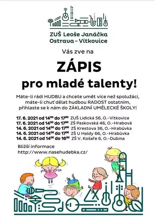 Základní umělecká škola dr. Leoše Janáčka, Ostrava-Vítkovice, příspěvková organizace, Vás zve na Zápis pro malé talenty. Máte-li zájem umět více než Vaši spolužáci, máte-li chuť dělat hudbou radost ostatním, přijďte nám ukázat svůj talent.