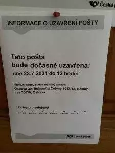 Ve čtvrtek 22. července 2021 nepůjde z technických důvodů celé dopoledne elektrický proud v budově úřadu městského obvodu Ostrava-Hrabová. V dané době bude uzavřen objekt úřadu a to včetně pošty. Pobočka České pošty bude uzavřena do 12. hod. a poštovní služby budou zajištěny poštou: Ostrava 30, Bohumíra Cetyny 1047/12, Bělský Les 70030, Ostrava.