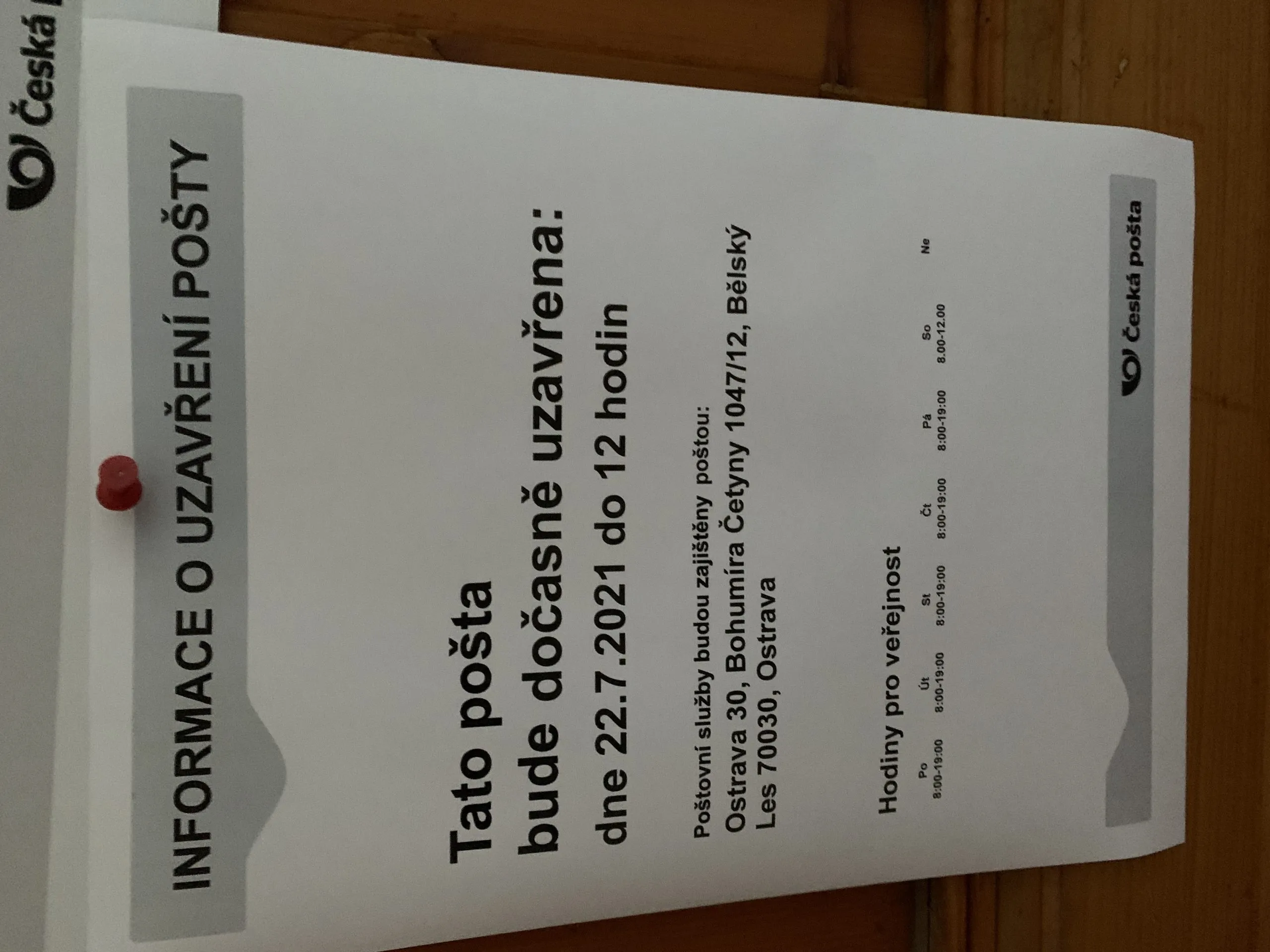 Ve čtvrtek 22. července 2021 nepůjde z technických důvodů celé dopoledne elektrický proud v budově úřadu městského obvodu Ostrava-Hrabová. V dané době bude uzavřen objekt úřadu a to včetně pošty. Pobočka České pošty bude uzavřena do 12. hod. a poštovní služby budou zajištěny poštou: Ostrava 30, Bohumíra Cetyny 1047/12, Bělský Les 70030, Ostrava.