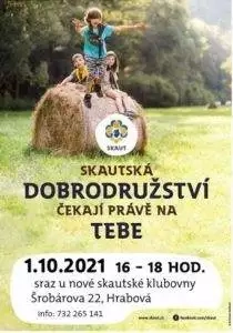 - Akce 1.10. 2021 je pouze náborová. Rodiče a ani děti nemusí sebou nic mít. Veškeré informace budou rodičům podávat na této akci, kde se dozví informace o tom, co je skauting apod. – dostanou i informace v papírové formě.
