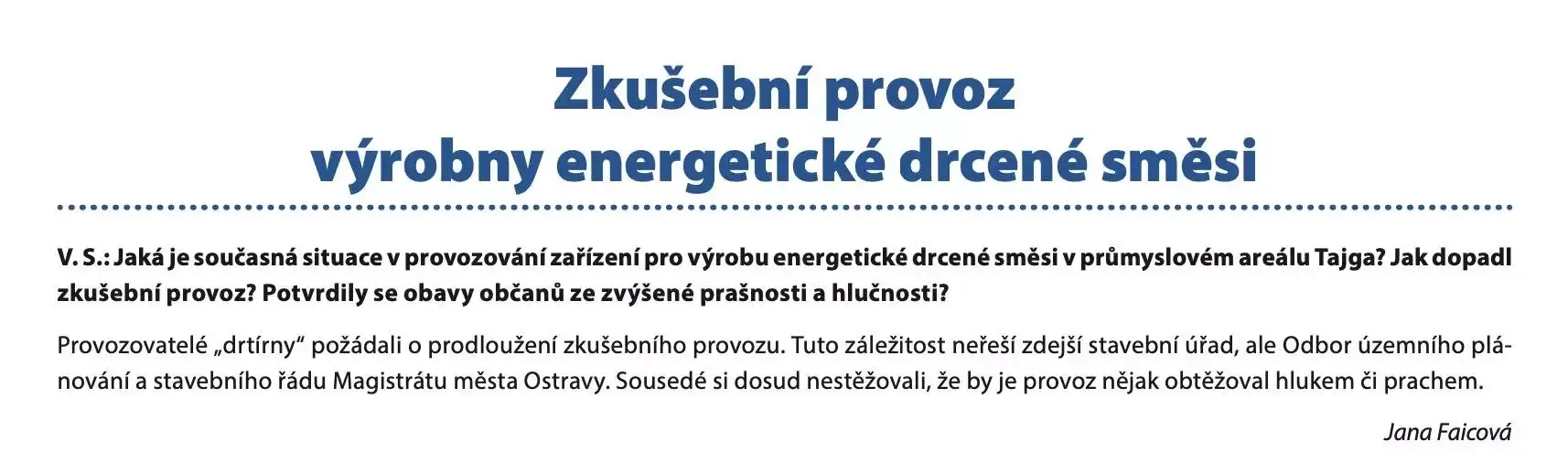 Paní Faicová mi na stejnou otázku, na kterou odpovídá v Hrabovských listech, nedokázala v březnu letošního roku odpovědět, proto jsem informace zjišťoval tehdy já na Magistrátě města Ostravy. Jenže březen 2021 je daleko a informace v Hrabovských listech jsou dnes již půl roku staré, viz můj článek na Hrabová.Info (březen/2021) Prodloužení zkušebního provozu drtičky odpadu v Ostravě-Hrabové.