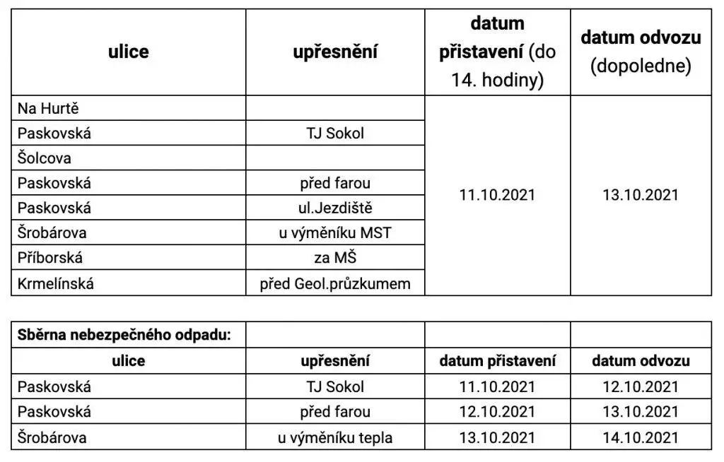 Úřad městského obvodu Hrabová zajistil ve dnech 11.10. 2021 – 13.10. 2021 (přistavení a odvoz během dopoledne) přistavení kontejnerů na velkoobjemový odpad.