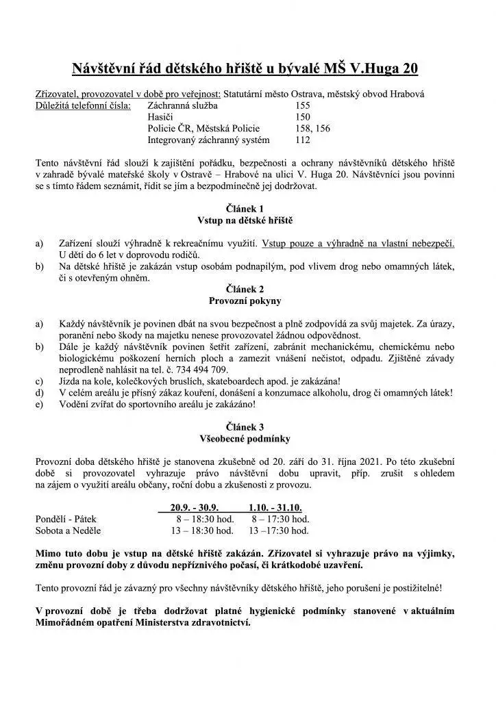 Městský obvod Hrabová od 20.9.2021 otvírá pro veřejnost dětské hřiště v zahradě bývalé mateřské školy na ul. V. Huga 20 v Ostravě – Hrabové. Návštěvní a provozní řád naleznete v článku na hrabova.info.