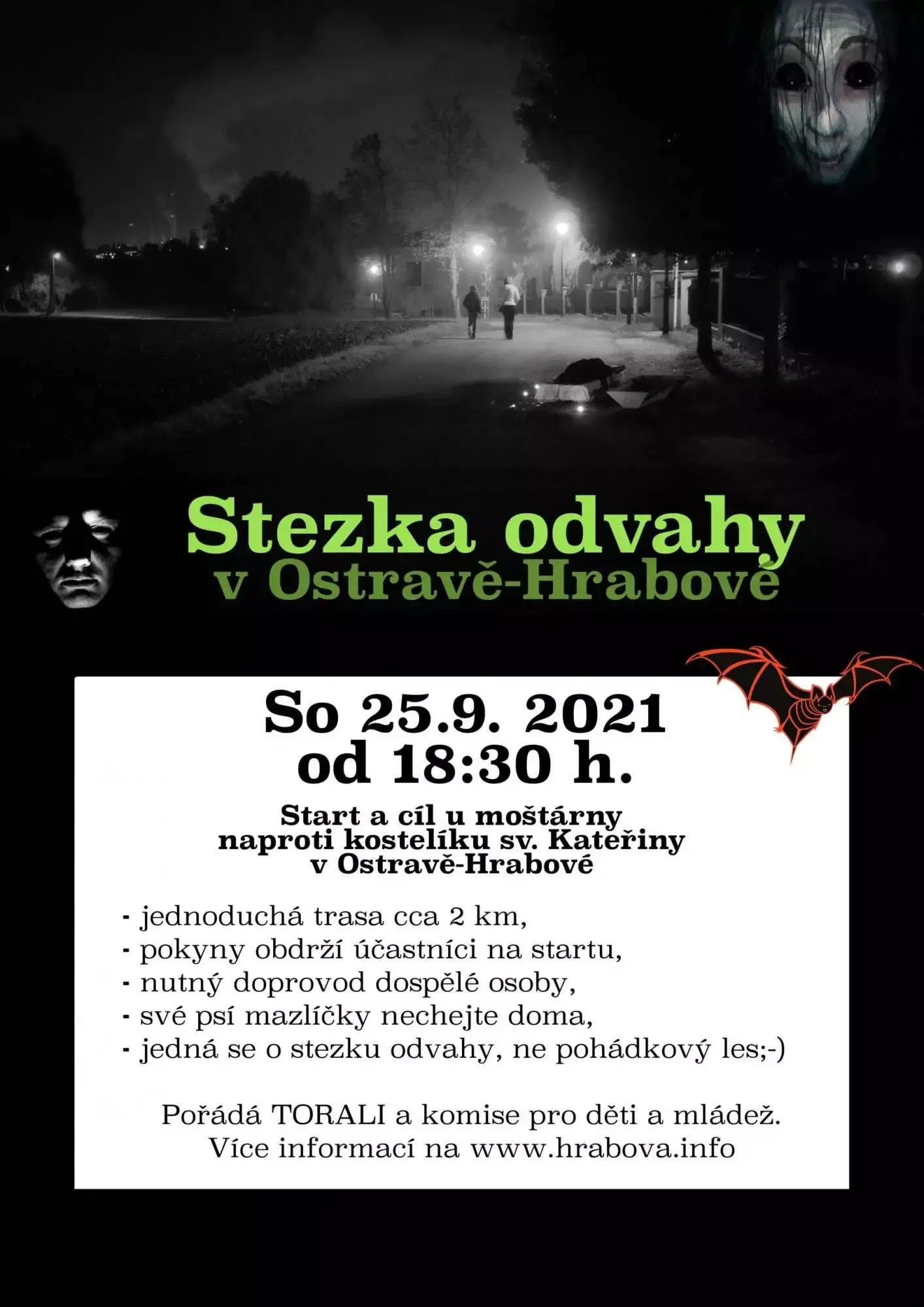 Spolek TORALI a Komise pro děti a mládež RMOb Hrabová zvou všechny odvážné děti a rodiče na stezku odvahy, která se koná již tuto sobotu 25. září 2021 od 18:30 hod. (start v 5 minutových intervalech). Upozorňujeme, že se jedná o stezku odvahy, ne pohádkový les;-)