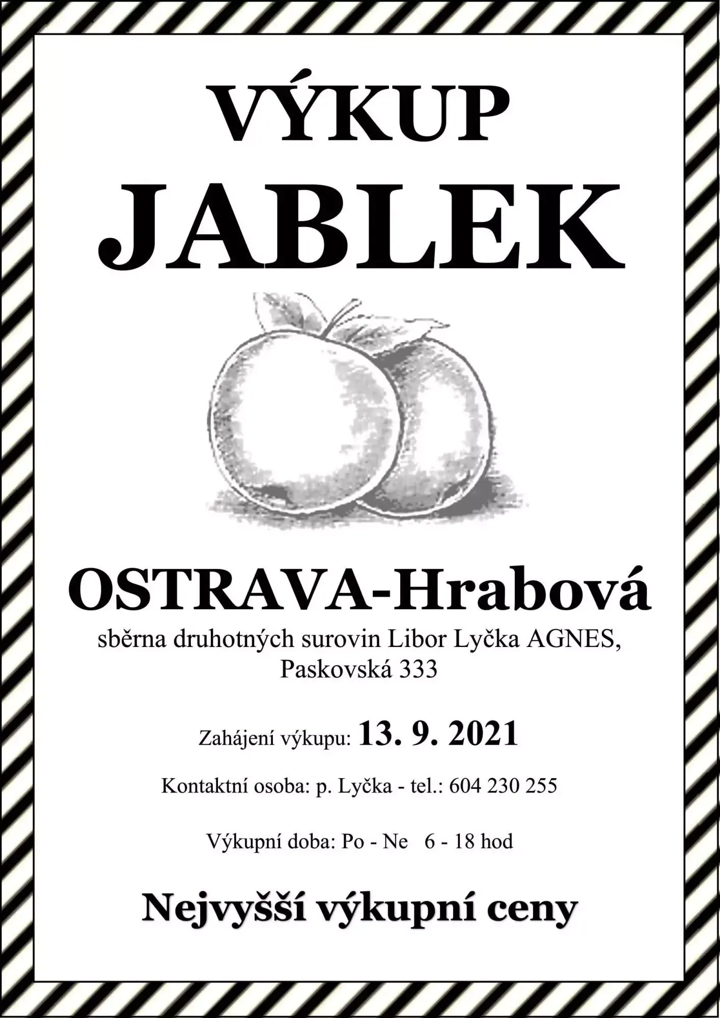 S̶b̶ě̶r̶n̶a̶ ̶d̶r̶u̶h̶o̶t̶n̶ý̶c̶h̶ ̶s̶u̶r̶o̶v̶i̶n̶ ̶L̶i̶b̶o̶r̶ ̶L̶y̶č̶k̶a̶ ̶A̶G̶N̶E̶S̶ ̶v̶ ̶O̶s̶t̶r̶a̶v̶ě̶-̶H̶r̶a̶b̶o̶v̶é̶ ̶v̶y̶k̶u̶p̶u̶j̶e̶ ̶j̶a̶b̶l̶k̶a̶.̶ ̶V̶ý̶k̶u̶p̶ ̶b̶y̶l̶ ̶z̶a̶h̶á̶j̶e̶n̶ ̶j̶i̶ž̶ ̶v̶ ̶p̶o̶l̶o̶v̶i̶n̶ě̶ ̶z̶á̶ř̶í̶.̶ ̶V̶ý̶k̶u̶p̶n̶í̶ ̶d̶o̶b̶a̶:̶ ̶P̶o̶ ̶–̶ ̶N̶e̶ ̶6̶ ̶–̶ ̶1̶8̶ ̶h̶o̶d̶.̶ ̶K̶o̶n̶t̶a̶k̶t̶n̶í̶ ̶o̶s̶o̶b̶a̶:̶ ̶p̶a̶n̶ ̶L̶y̶č̶k̶a̶ ̶–̶ ̶t̶e̶l̶.̶:̶ ̶6̶0̶4̶ ̶2̶3̶0̶ ̶2̶5̶5̶.̶