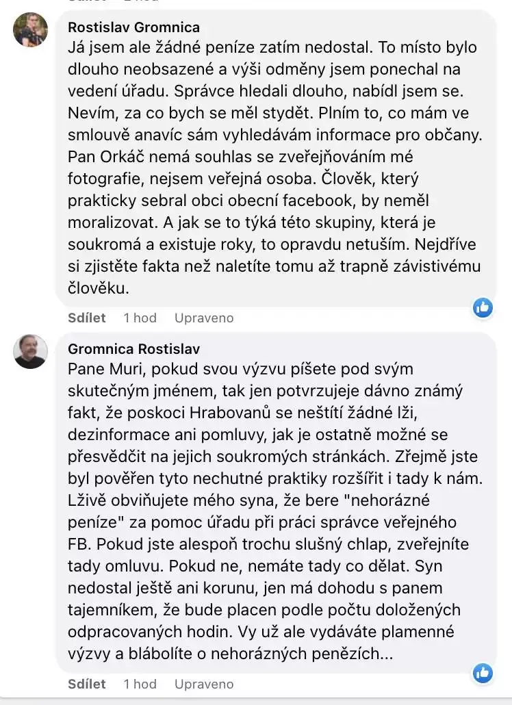Prostřednictvím tajemníka úřadu jsem posílal vedení MOb nabídku, že budu dělat web obce i facebookovou stránku obce ZADARMO. Naposledy jsem to psal tajemníkovi dne 5.1. 2022 a dohoda s panem Gromnicou byla sepsána až v březnu. Pak se člověk dozví, že to dělá syn zastupitele a za pouhé nasdílení (ne vytvoření) informace dostane stovku…