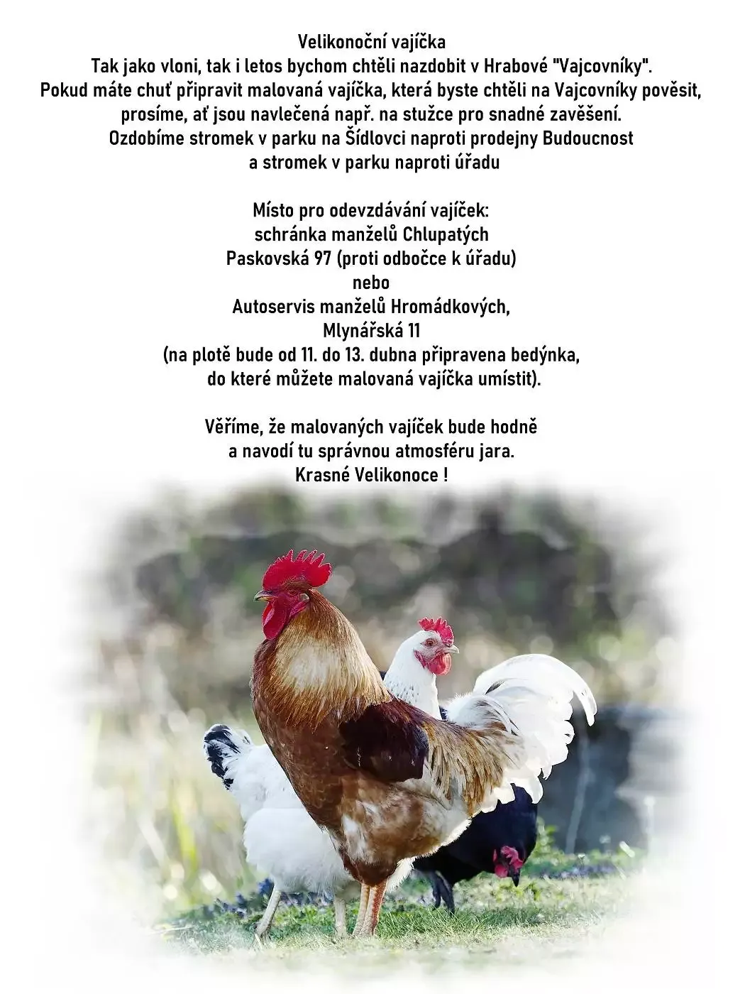 Tak jako vloni, tak i letos bychom chtěli nazdobit v Hrabové „Vajcovníky“. Pokud máte chuť připravit malovaná vajíčka, která byste chtěli na Vajcovníky pověsit, prosíme, ať jsou navlečené např. na stužce pro snadné zavěšení. Ozdobíme stromek v parku na Šídlovci naproti prodejny Budoucnost a stromek v parku naproti úřadu.