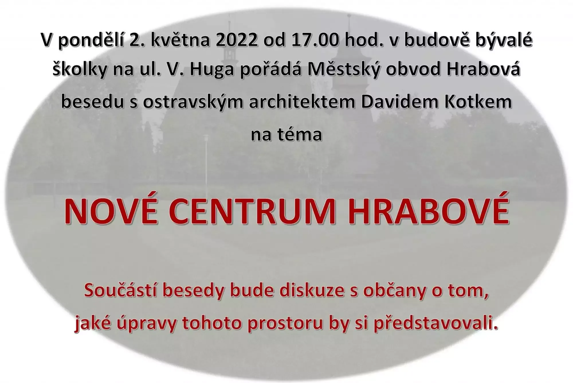 Zveme Vás na besedu s ostravským architektem Davidem Kotkem na téma Nové centrum Hrabové, která se uskuteční v budově bývalé školky na ulici V. Huga v pondělí 2.5. 2022 od 17 hodin.