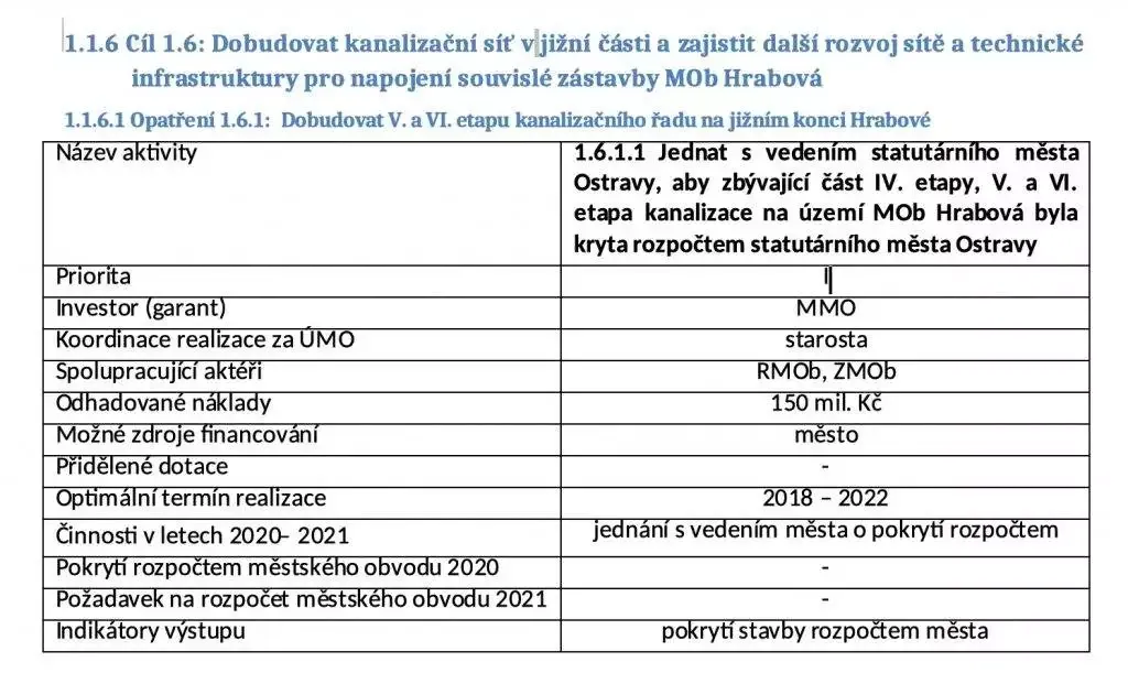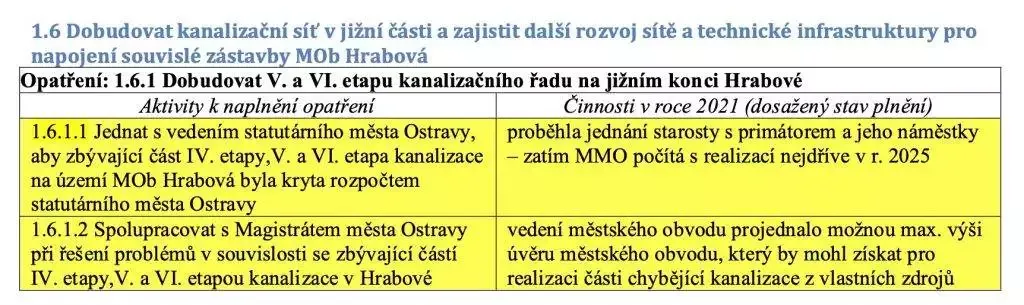 1. Ve zprávě o realizaci Strategie 2021 se v bodě „1.6.1 Dobudovat V. a VI. etapu kanalizačního řadu na jižním konci Hrabové“ pro rok 2021 píše: „Proběhla jednání starosty s primátorem a jeho náměstky – zatím MMO počítá s realizací nejdříve v r. 2025“