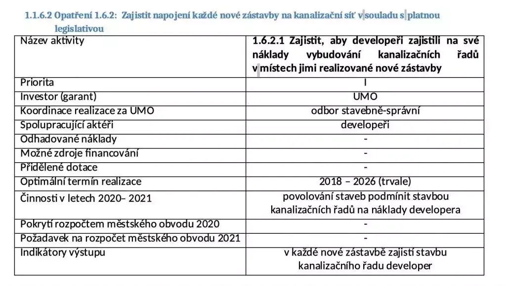 4. Ve strategickém plánu se v bodu „1.6.2.1 Zajistit, aby developeři zajistili na své náklady vybudování kanalizačních řadů v místech jimi realizované nové zástavby“ píše: Koordinace realizace za ÚMO odbor stavebně-správní. V každé nové zástavbě zajistí stavbu kanalizačního řadu developer.