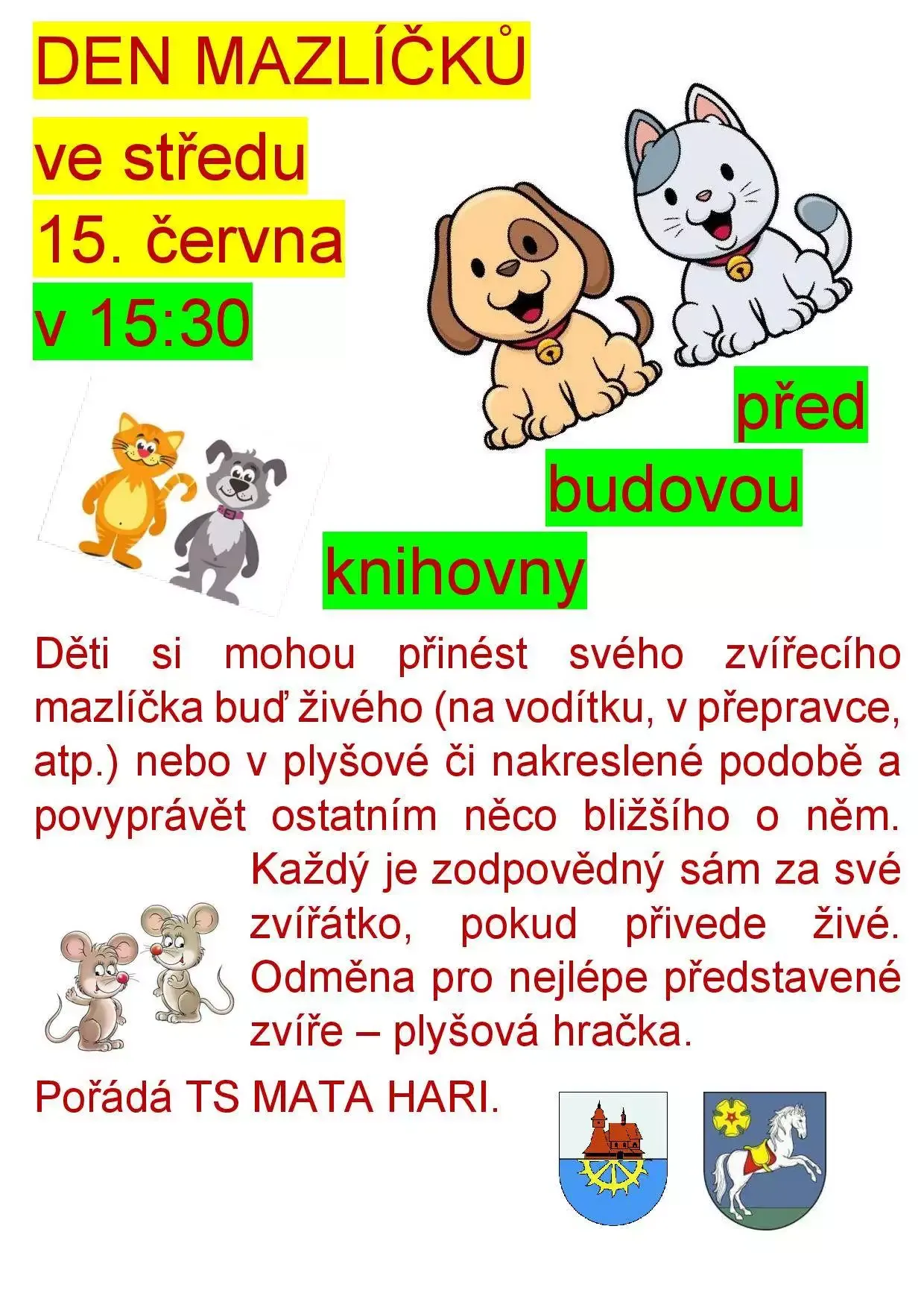 Manželé Poláčkovi Vás zvou na akci Den mazlíčků, která se koná ve středu 15. června v 15:30 před budovou knihovny v Ostravě-Hrabové. Děti si mohou přinést svého zvířecího mazlíčka buď živého (na vodítku, v přepravce, atp.) nebo v plyšové či nakreslené podobě a povyprávět ostatním něco bližšího o něm.