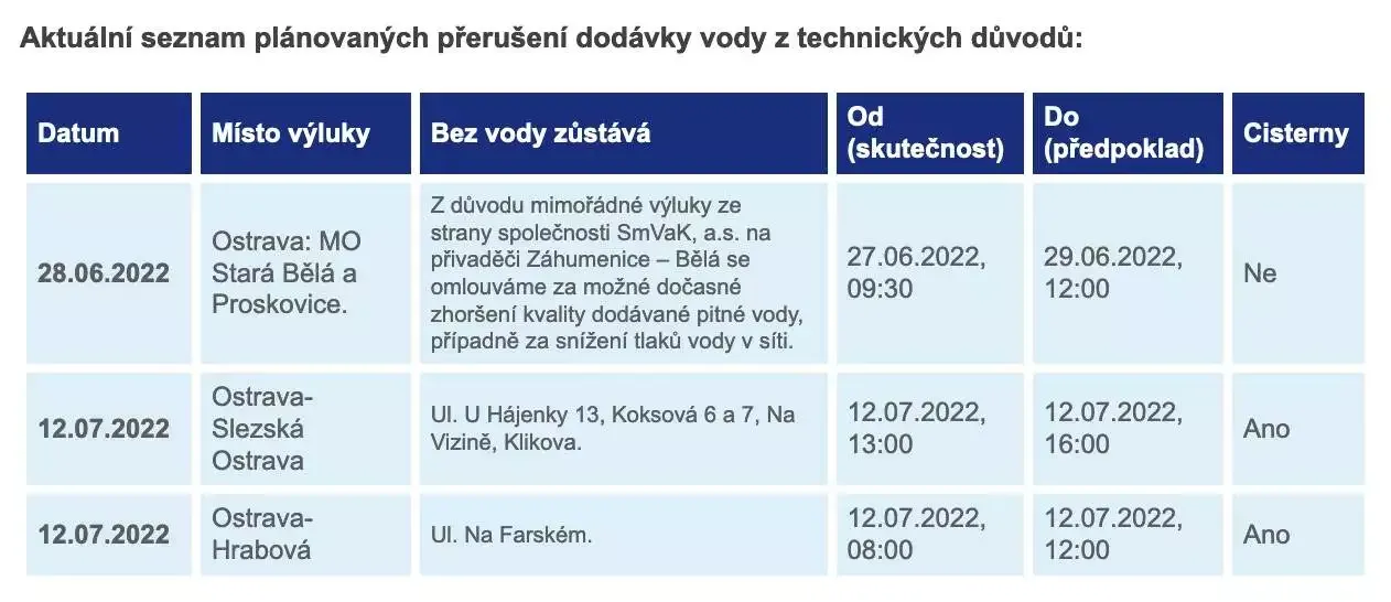 Ostravské vodárny a kanalizace upozornňují, že dne 12.7. 2022 dojde k plánované odstávce pitné vody na ul. Na Farském. V daný den budou přistaveny cisterny.