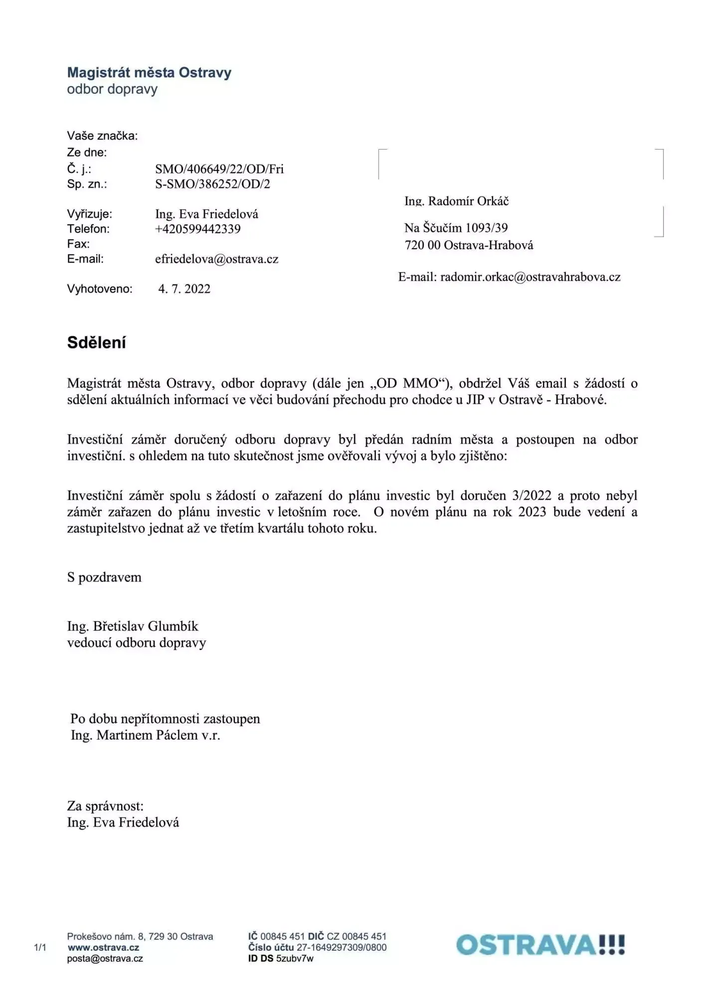 V únoru letošního roku jsem informoval, že město Ostrava poskytne peníze na vybudování osvětlení a přístupu k autobusové zastávce na ulici Frýdecká u prodejny JIP. Dle aktuálních informací byl investiční záměr spolu s žádostí o zařazení do plánu investic doručen na magistrát až v březnu 2022, a proto nebyl záměr zařazen do plánu investic v letošním roce.