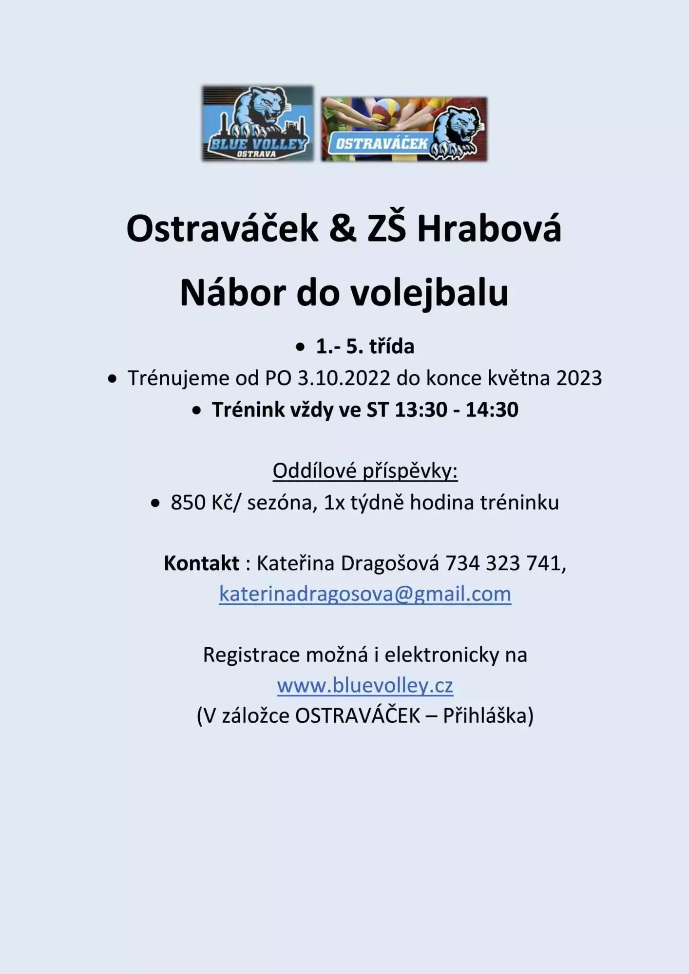 Volejbalový klub Blue Volley Ostrava, z.s. a jeho kroužky Ostraváčku startují při základní škole v Ostravě-Hrabové nábor dětí (1.- 5. třída) do volejbalu. Trénujeme od pondělí 3.10. 2022 do konce května 2023. Trénink vždy ve středu 13:30 – 14:30 hod.
