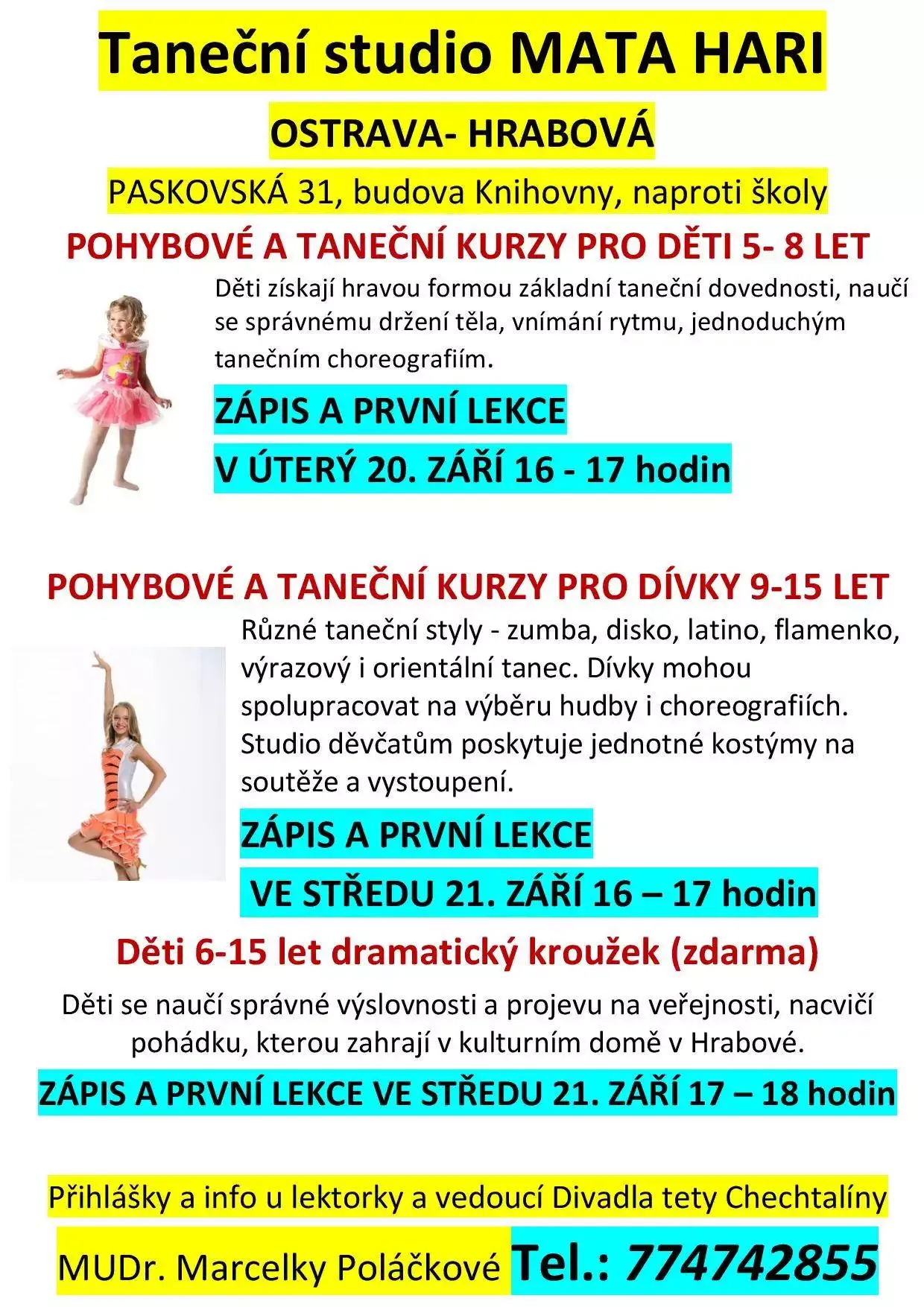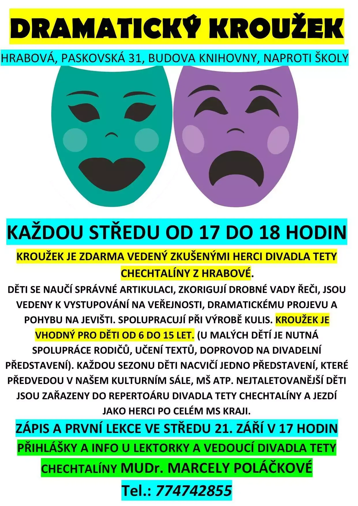Spolek MUDr. Marcely Poláčkové opět od září spouští dramatický kroužek pro děti i pohybové a taneční kurzy pro děti. Více informací naleznete na přiložených plakátech.