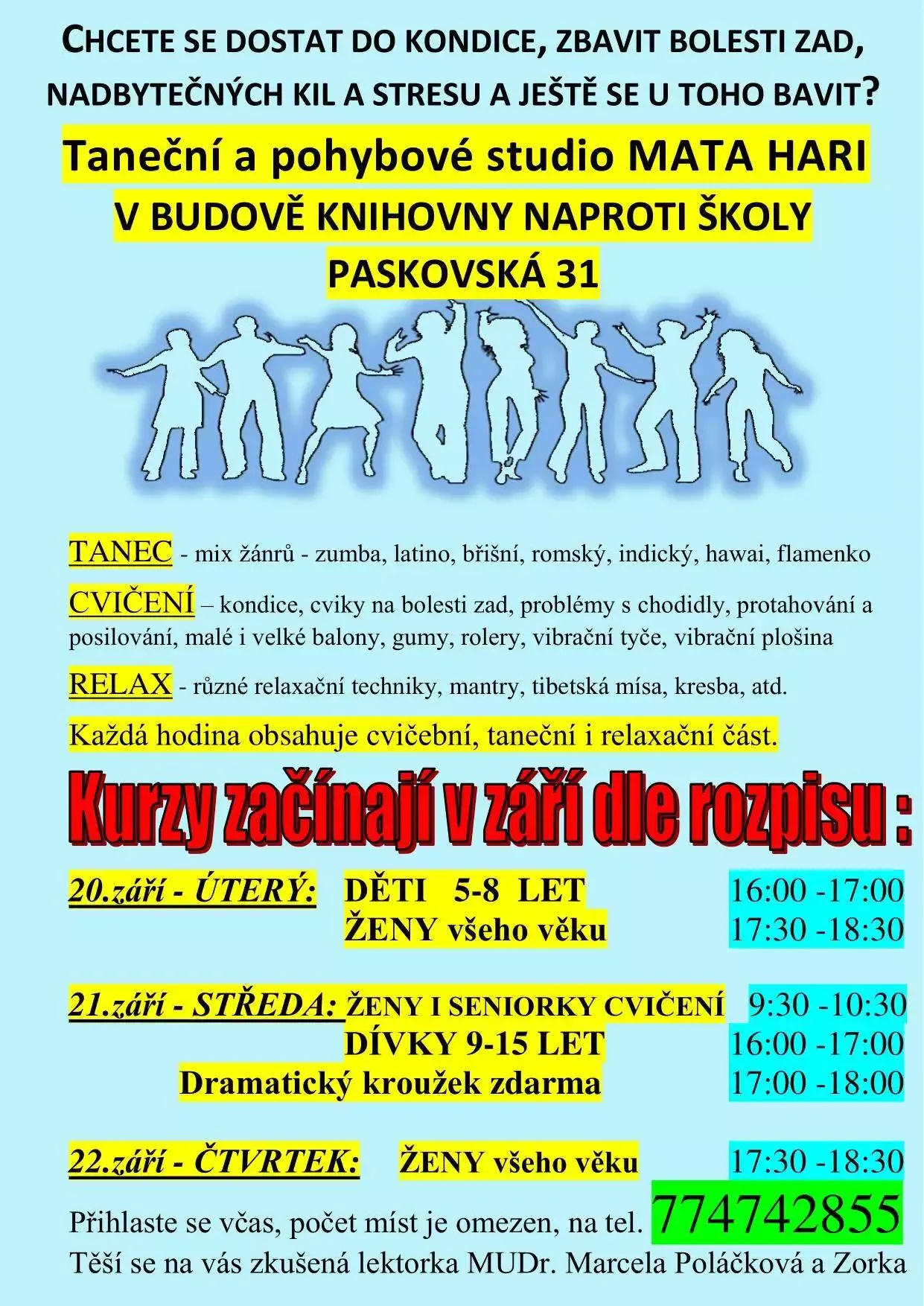 Velký výběr pohybových a tanečních lekcí i cvičení pro všechny věkové skupiny od malých dětí, slečen, žen až po seniorky. Jen u pohybu, který vás bude bavit vytrváte delší dobu. Začíná se již příští týden! Přihlášky na tel. č. 774 742 855.