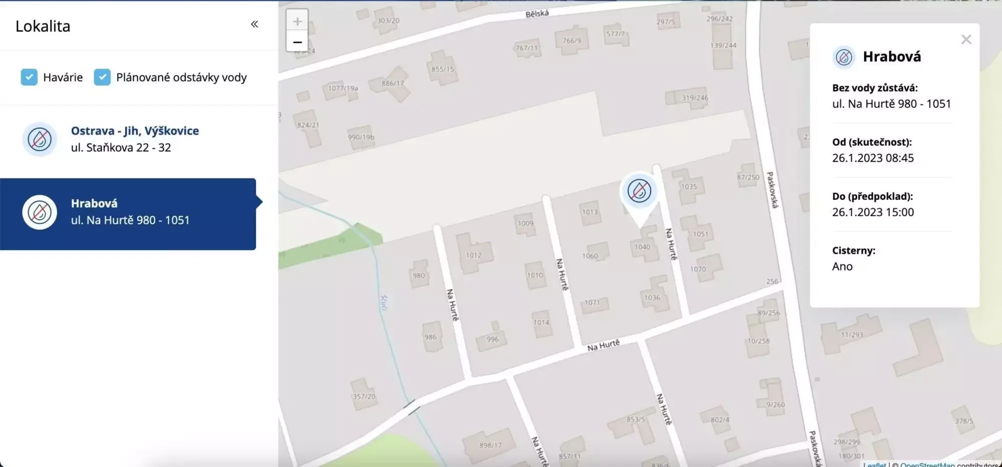 ObdrĹľeli jsme informaci od OVAK a.s., Ĺľe nepoteÄŤe voda v ul. Na HurtÄ› 980 – 1051 od 8:45 do 15:00 hod. NáhradnĂ zásobovánĂ pitnĂ© vody je zajištÄ›no autocisternami.