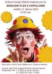 - Maškarní ples pro děti s Hopsalínem – 12.3. 2023 od 10. hod. Vstupné 20 Kč děti a 80 Kč dospělí.