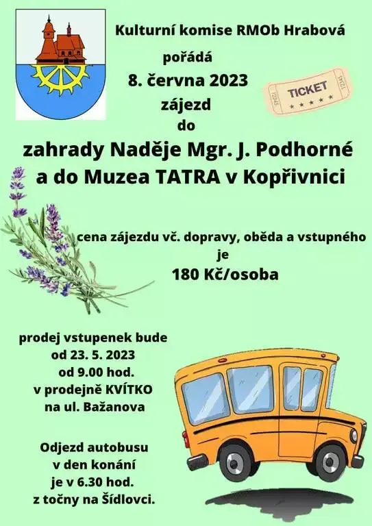 Zveme Vás na zájezd do zahrady NadÄ›je panĂ Mgr. J. PodhornĂ© a do Muzea TATRA v KopĹ™ivnici. Cena zájezdu vÄŤetnÄ› dopravy, obÄ›da a vstupnĂ©ho je 180 korun za osobu. Prodej vstupenek bude zahájen dne 23. 5. 2023 od 9.00 hod. v prodejnÄ› KvĂtko na ulici BaĹľanova. Odjezd autobusu v den konánĂ je v 6.30 hod. z toÄŤny na Ĺ Ădlovci.