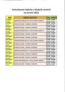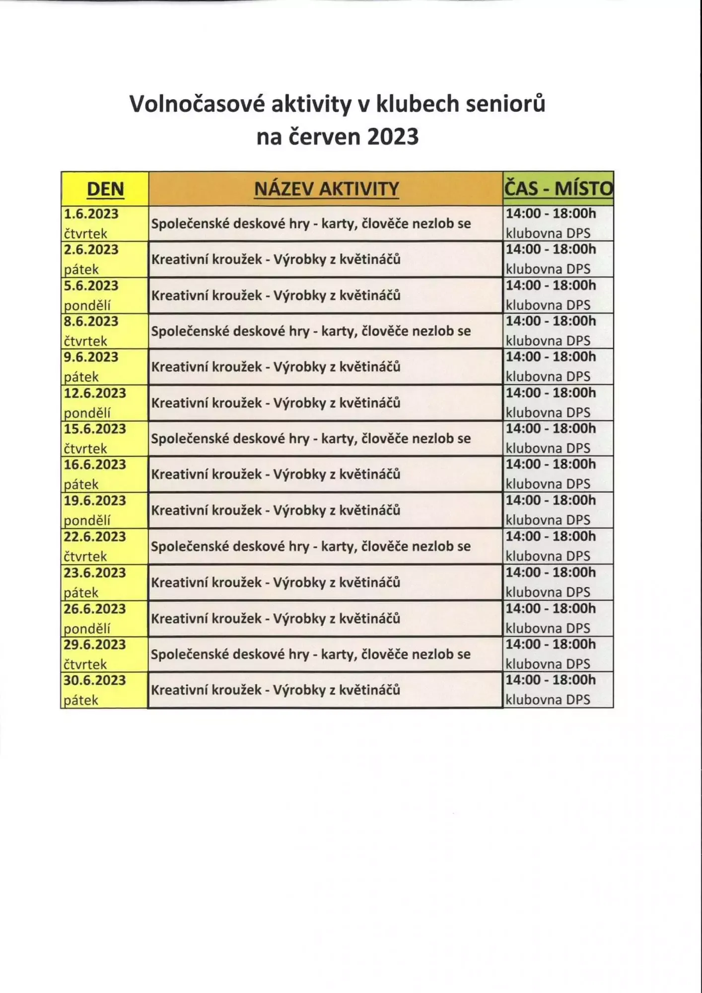 Volnočasové aktivity pro měsíc červen 2023 v DPS Bělská 28.
