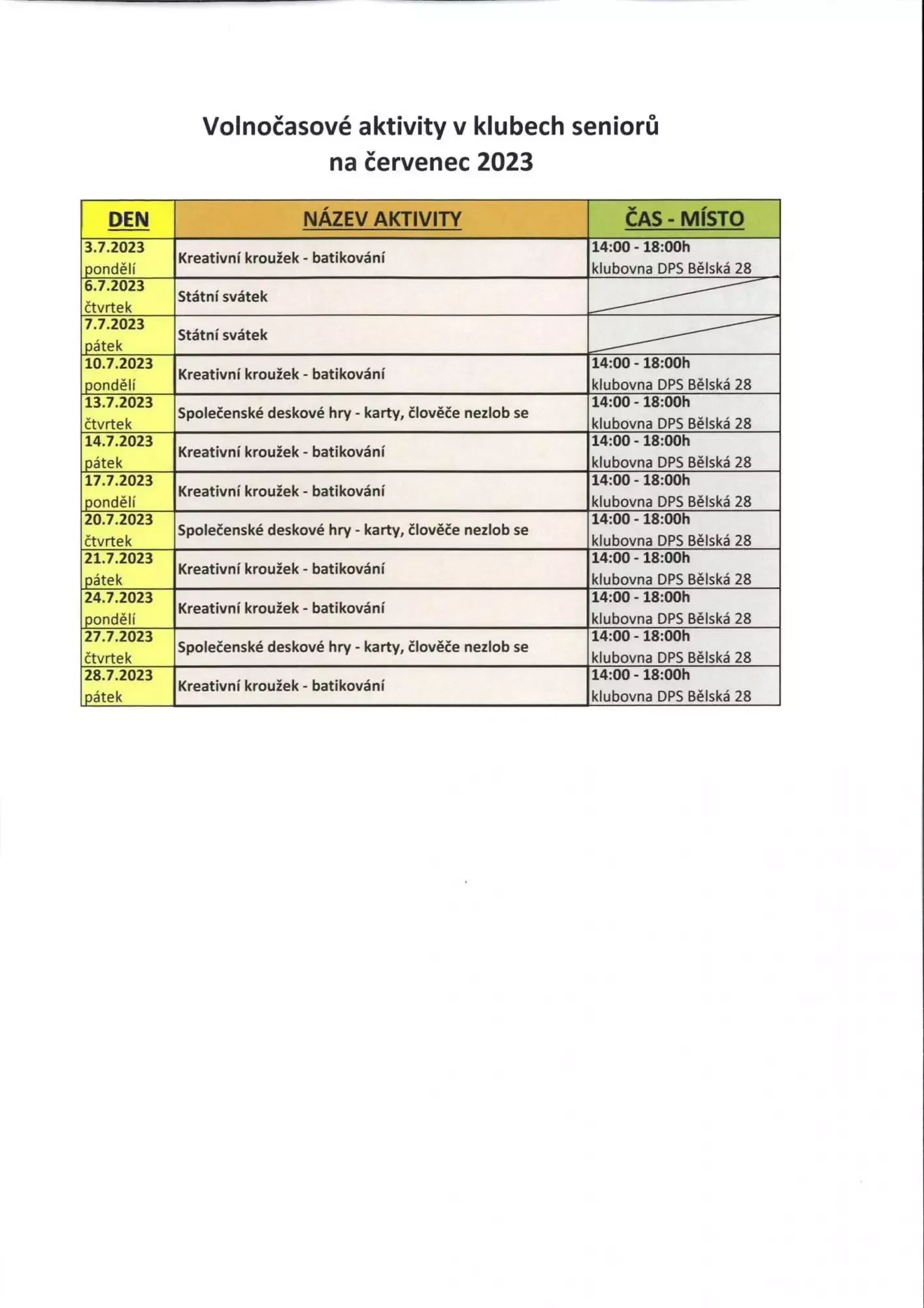 Volnočasové aktivity pro měsíc červenec 2023 v DPS Bělská 28.
