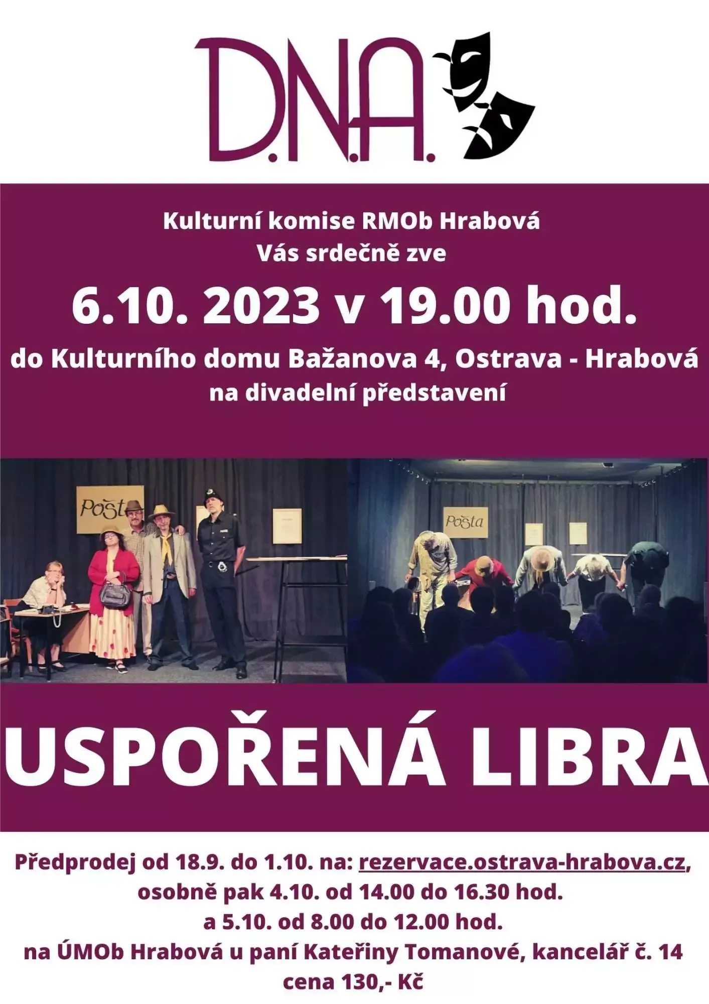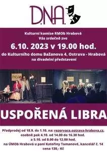 KulturnĂ komise Vás srdeÄŤnÄ› zve do kulturnĂho domu v HrabovĂ© na divadelnĂ pĹ™edstavenĂ UspoĹ™ená libra, kterĂ© se uskuteÄŤnĂ v pátek 6. Ĺ™Ăjna od 19. hod. PĹ™edprodej online od 18.9. do 1.10. 2023 na rezervace.ostrava-hrabova.cz. OsobnĂ prodej 4.10. 2023 od 14.00 do 16.30 hod. a 5.10. 2023 od 8.00 do 12.00 hod. na ĂšMOb Hrabová u panĂ KateĹ™iny TomanovĂ© (kancelář ÄŤ. 14). Cena vstupenky 130 KÄŤ.