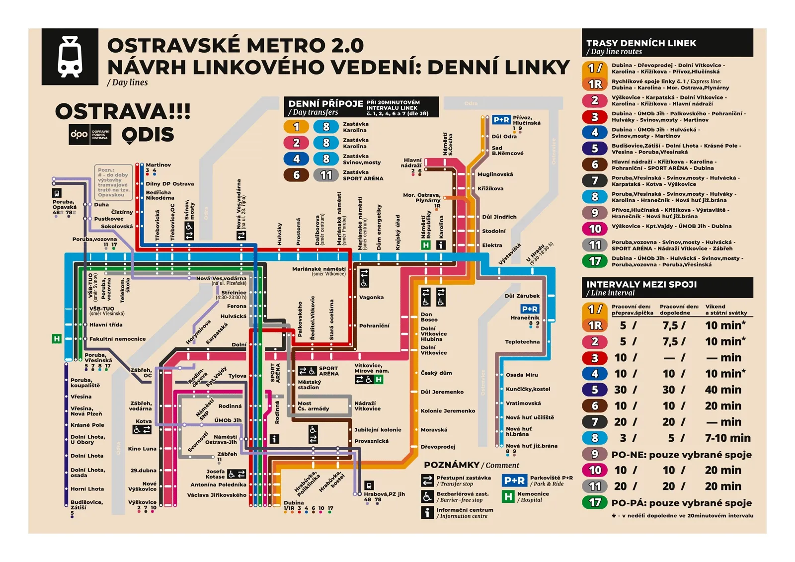 Zároveň zachovává výhody původního konceptu změn, který představují tři páteřní linky č. 1, 2 a 8, které budou jezdit ve špičce v intervalu tří a pěti minut a o víkendech každých deset minut. Dalších devět linek bude na tyto páteřní navazovat. Systém linkového vedení pro Ostravu s novými úpravami je pracovně pojmenován jako Ostravské metro 2.0.