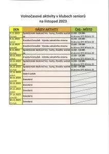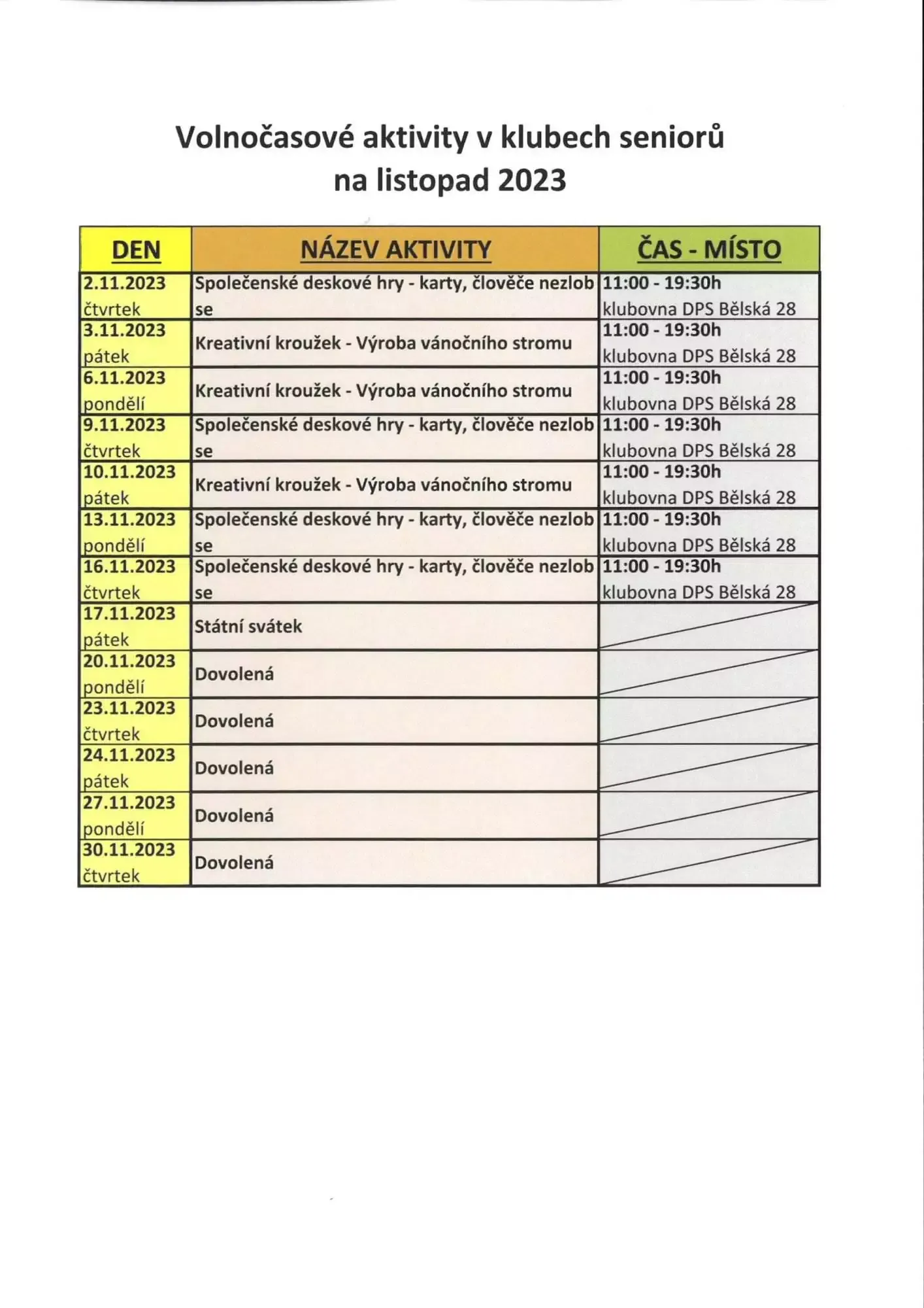 Volnočasové aktivity pro měsíc listopad 2023 v DPS Bělská 28.