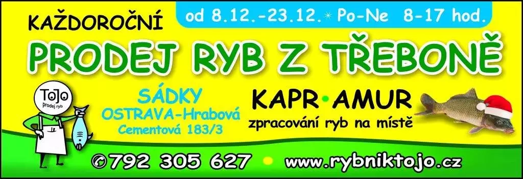 V Ostravě-Hrabové se i letos budou prodávat ryby. Prodej bude zahájen dne 8. prosince a ukončen 23. prosince 2023. Prodejní doba od 8 hodin do 17 hodin a kuchání ryby je zde zajištěno. Sádky se nacházejí naproti stavebnin Best Ostrava s.r.o. (zastávka MHD – Beta), Cementová 183/3.