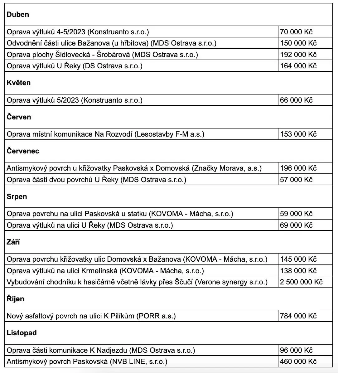 V minulém čísle Hrabovských listů jsem slíbil, že pro listopadové číslo sepíšu rekapitulaci toho, které komunikace jsme stihli letos opravit. Dle níže uvedených informací jsme na opravy letos vynaložili kolem 7,5 milionů korun. Od této částky musíme odečíst (v rozpočtu ušetřené peníze) příspěvek ve výši 2 miliónů korun, který jsme obdrželi od Státního fondu dopravní infrastruktury na vybudování chodníku/lávky k hasičárně. Pro srovnání ještě uvedu, že v roce 2021 se na opravy vynaložilo pouhých 2,7 milionů korun, které předchozí vedení obce převedlo na opravy komunikací z bytového fondu, kde nyní peníze chybí.