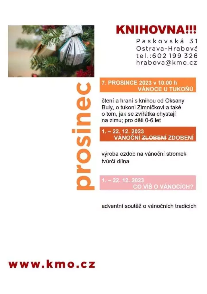 Co si pro Vás naše knihovnice Eva Vytasilová připravila pro měsíc prosinec? Přijměte pozvání do hrabovské knihovny na 7. prosince 2023 v 10.00 hodin, kde se koná akce pro děti 0-6 let s názvem Vánoce u tukoňů. Děti si budou číst a hrát s knihou od Oksany Buly, která pojednává o tukoni Zimníčkovi a také o tom, jak se zvířátka chystají na zimu.