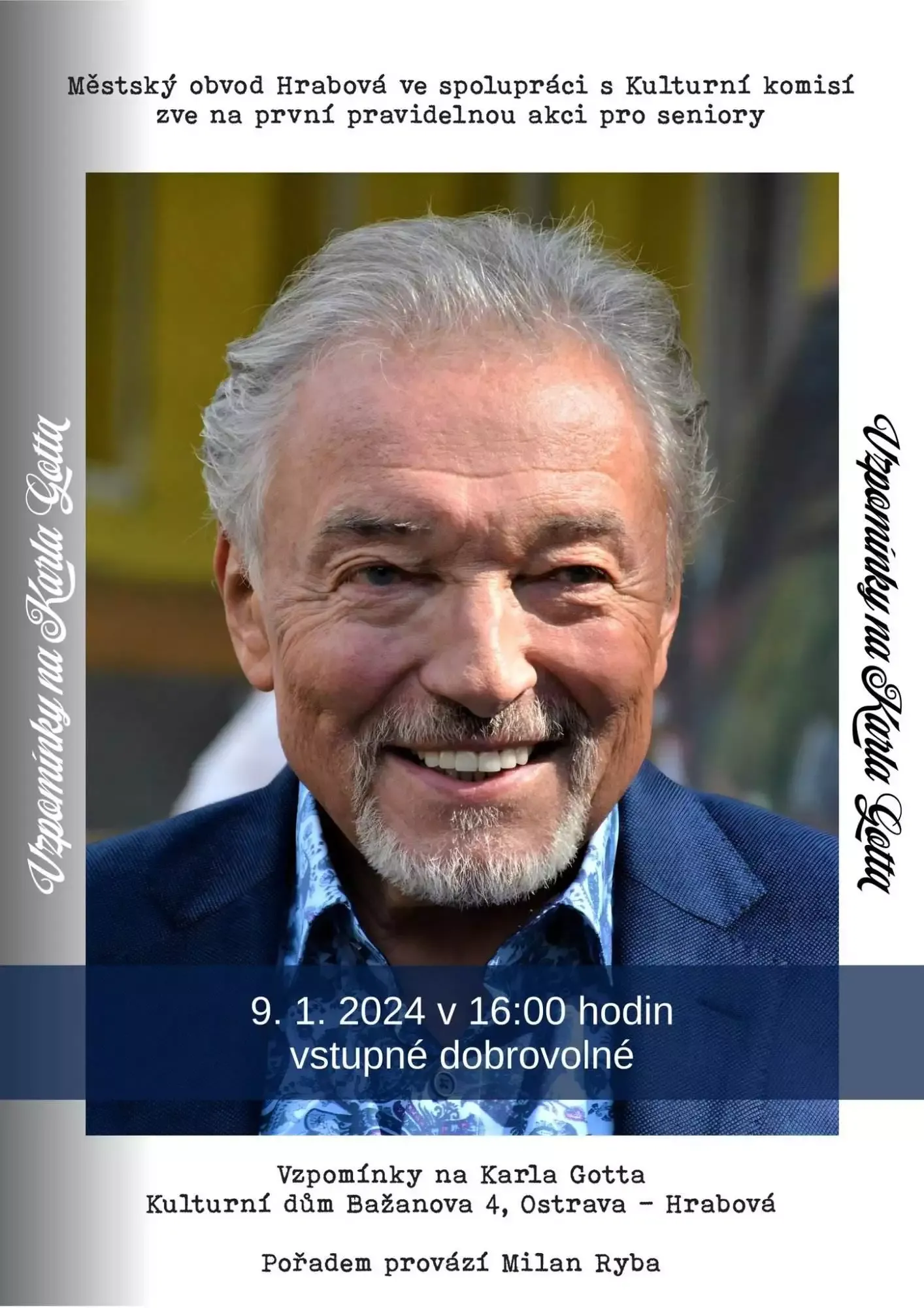 Srdečně Vás zveme 9. ledna 2024 od 16:00 hodin do kulturního domu v Ostravě-Hrabové na první pravidelnou akci pro seniory Vzpomínky na Karla Gotta. Pořadem provází Milan Ryba. Vstupné dobrovolné.
