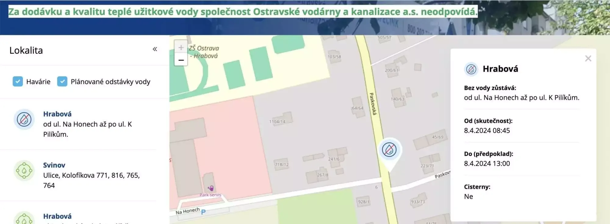 (Aktualizováno 8.4. 2024 10:00) Z dĹŻvodu havárie na vodovodnĂm Ĺ™adu nÄ›kde mezi ulicĂ Na Honech a ulicĂ BaĹľanova v souÄŤasnĂ© dobÄ› neteÄŤe v HrabovĂ© voda. Na opravÄ› se pracuje a zhruba do 10:30 bychom mÄ›li mĂt bližšà informace (budou i na webu https://www.ovak.cz/odstavky/).