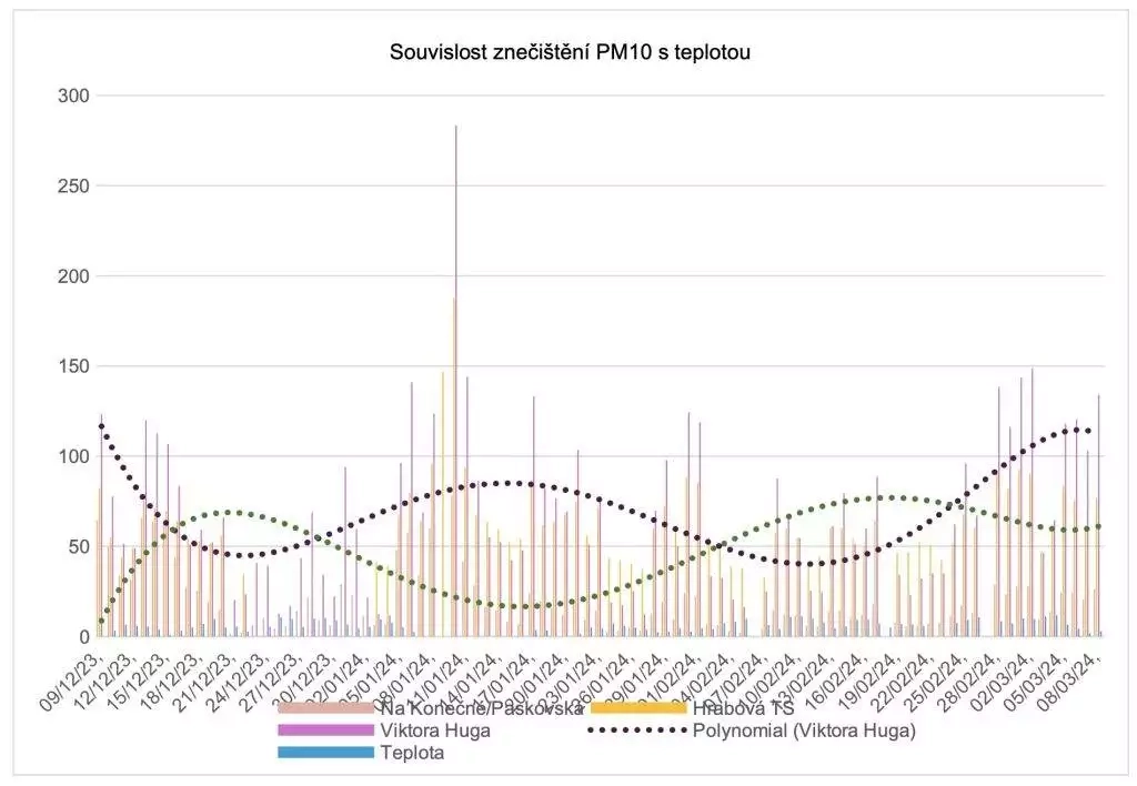V grafu jsou náhodně vybrané stanice v obvodu Hrabová, zobrazené také v trendu a porovnané s vývojem teplot. Na grafu je výborně vidět, že když jdou teploty nahoru, míra znečištění PM10 klesá a naopak, čím je větší zima, tím je znečištění PM10 vyšší. Samozřejmě to ovlivňují i další faktory, zejména rychlost proudění větru, kdy platí, že čím více fouká, tím jsou rozptylové podmínky lepší a znečištění menší.