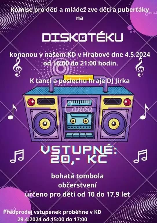 V sobotu 4. května 2024 se od 16 hodin uskuteční v pořadí v tomto roce již druhá diskotéka pro děti a mládež. Akci pořádá komise pro děti a mládež. Vstupenky v předprodeji v ceně 20 Kč můžete pořídit v pondělí 29. dubna 2024 od 15 do 17 hodin v Kulturním domě Ostrava-Hrabová. Opět se můžete těšit na super párty, hudbu a tombolu.