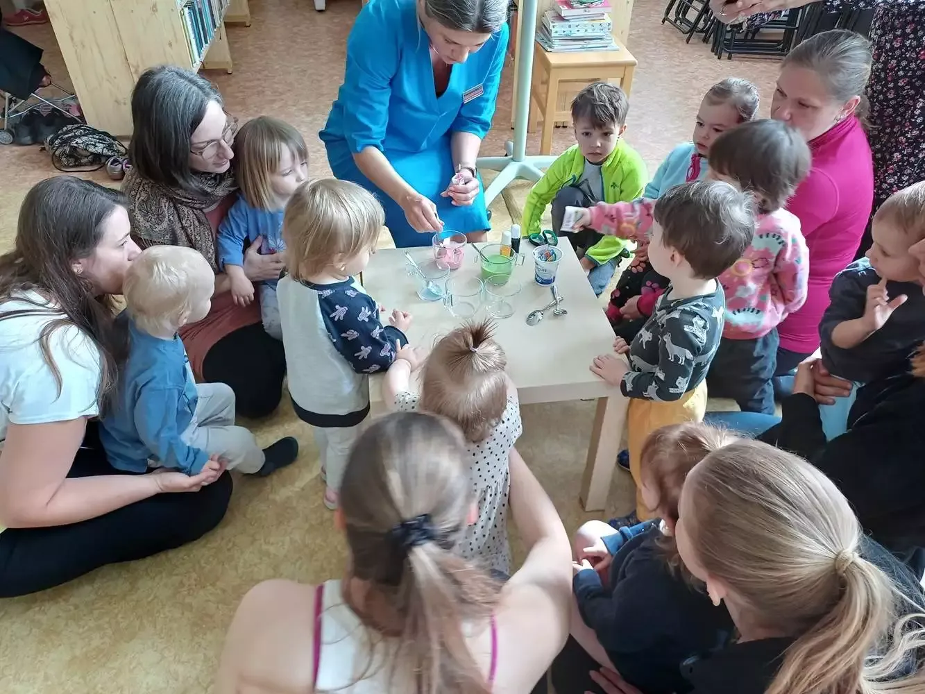 Dubnové setkání klubu pro nejmenší bylo plné barev. Děti si zacvičily, zhlédly pohádku, povozily se na padáku, zasadily semínka řeřichy a se zaujetím pozorovaly, jak mícháním vznikají nové barvy.