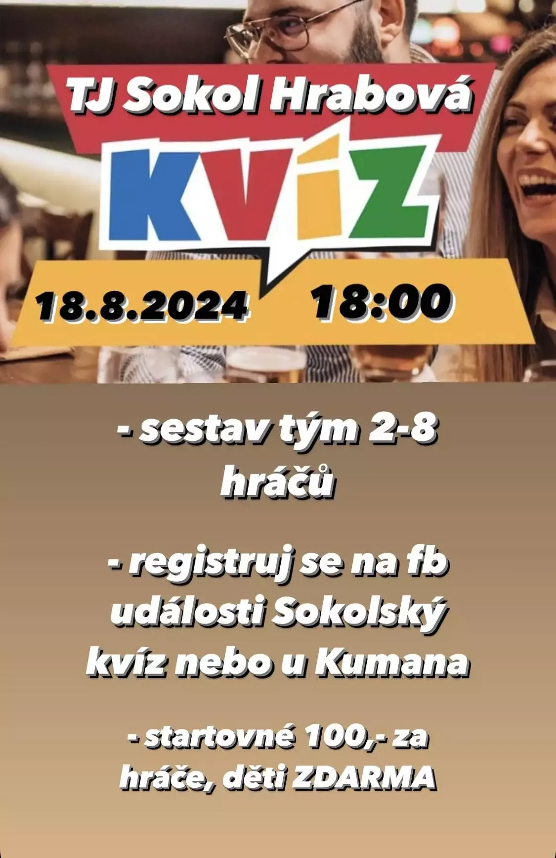 Zveme Vás na 1. SokolskĂ˝ kvĂz, kterĂ˝ bude 18.8. 2024 od 18:00 hod., vĂce info najdete v tĂ©to facebookovĂ© události. StartovnĂ© je 100,-/hráče, dÄ›ti mĹŻĹľete vzĂt s sebou. Otázky budou jak z aktuálnĂho dÄ›nĂ, všeobecnĂ©, tak i o HrabovĂ©. Budeme se těšit!