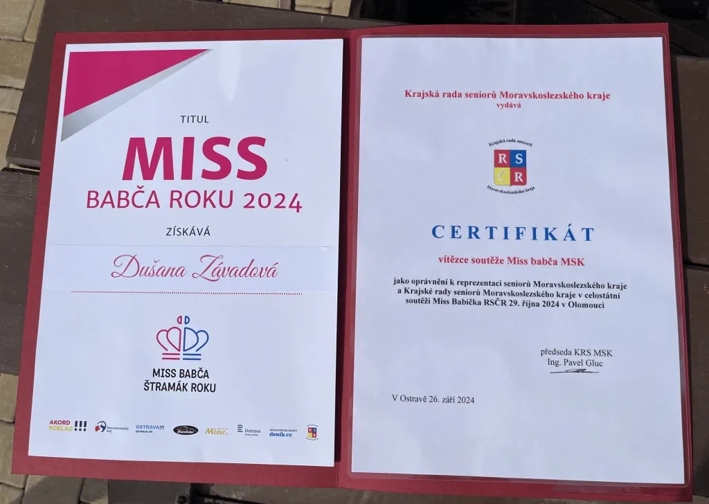 Miss Babča paní Dušana Závadová zároveň obdržela certifikát, který ji opravňuje k reprezentaci seniorů Moravskoslezského kraje a Krajské rady seniorů Moravskoslezského kraje v celostátní soutěži Miss Babička RSČR 29. října 2024 v Olomouci.
