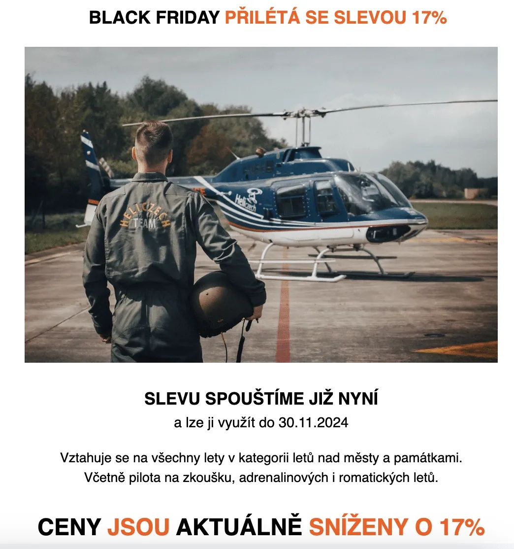 Získejte 17% slevu na všechny lety v kategorii „lety nad městy a památkami“. Tato nabídka platí do 30. listopadu 2024 a zahrnuje: