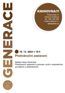 Srdečně Vás zveme na akci klubu Generace – Předvánoční zastavení, které se bude konat v hrabovské knihovně dne 19. prosince 2024 od 10 hodin. Přijďte si užít příjemné dopoledne plné pohody u knih, inspirativního povídání a drobného občerstvení.