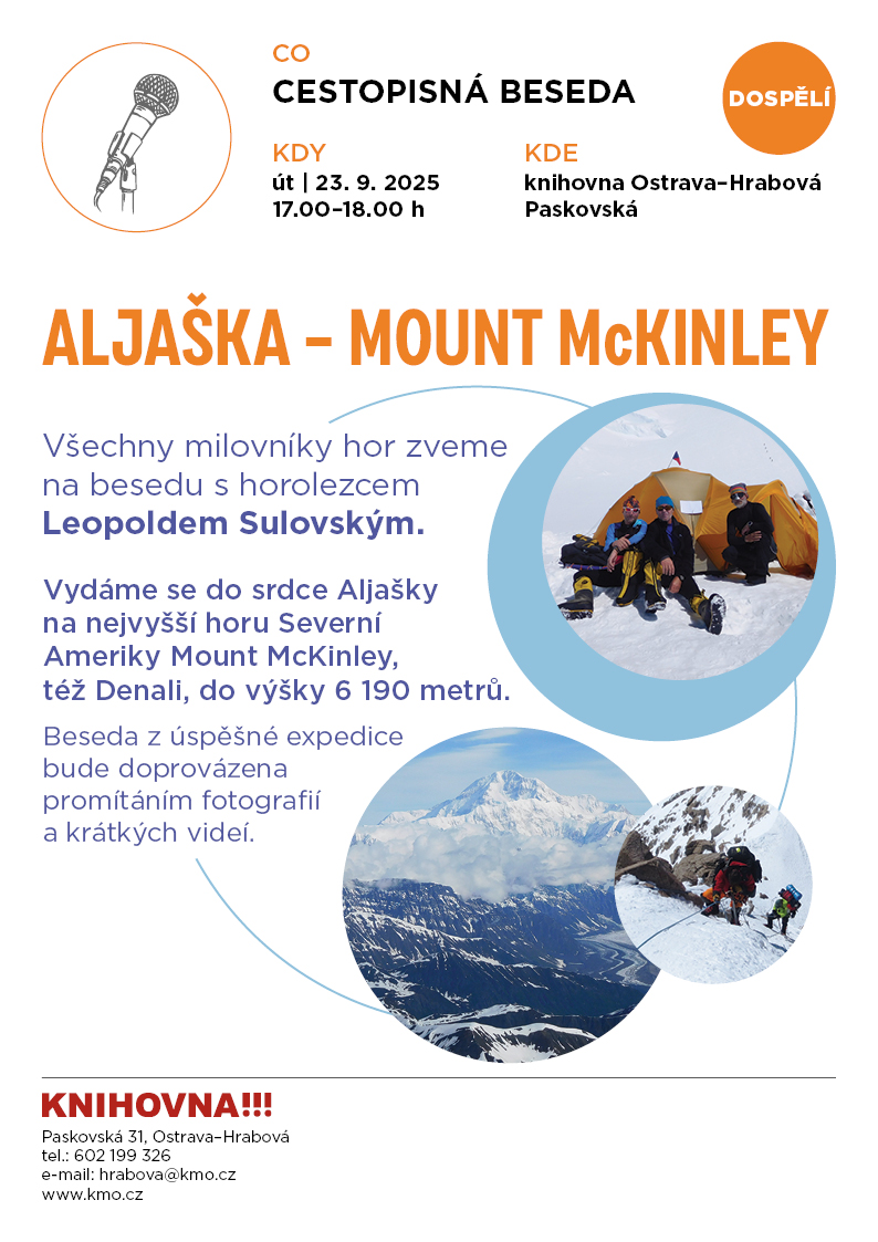 Knihovna v Ostravě-Hrabové zve všechny milovníky hor a dobrodružných výprav na jedinečnou cestopisnou besedu. O své zážitky z expedice na nejvyšší horu Severní Ameriky se podělí legendární horolezec Leopold Sulovský. Akce se uskuteční v úterý 23. září 2025 v naší knihovně v Hrabové.