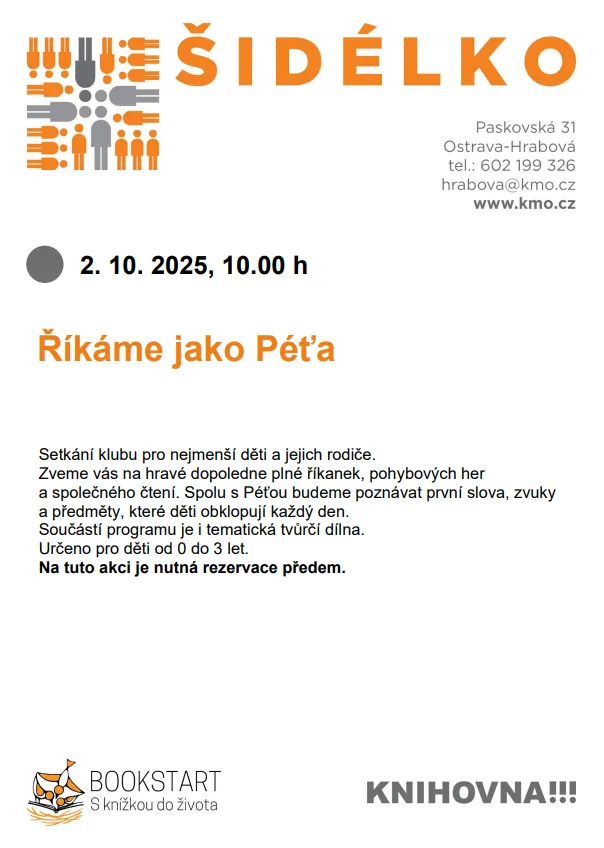Klub pro nejmenší děti a jejich rodiče. Zveme vás na hravé dopoledne plné říkanek, pohybových her a společného čtení. Spolu s Péťou budeme poznávat první slova, zvuky a předměty, které děti obklopují každý den. Součástí programu je výtvarná dílna pro nejmenší. Na tuto akci je nutná rezervace předem.