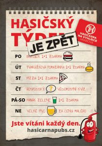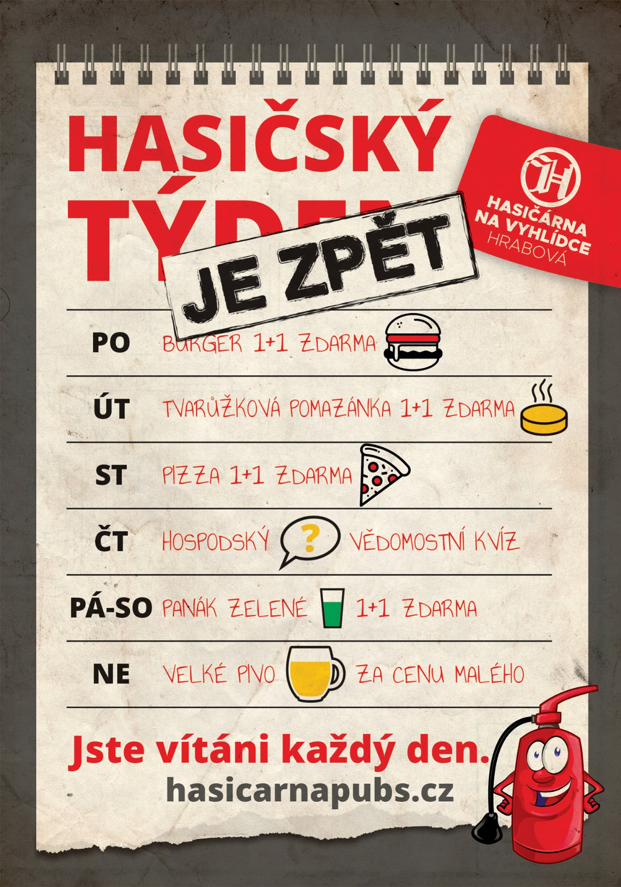 Hasičárně na Vyhlídce v Hrabové se znovu rozhořela atmosféra, kterou máme všichni rádi – jídlo, pití, smích, a hlavně akce, které hasí hlad i žízeň. Je tady Hasičský týden, což znamená jediné – každý den speciální akce na jídlo a pití! (akce níže platí jen v Hasičárně)